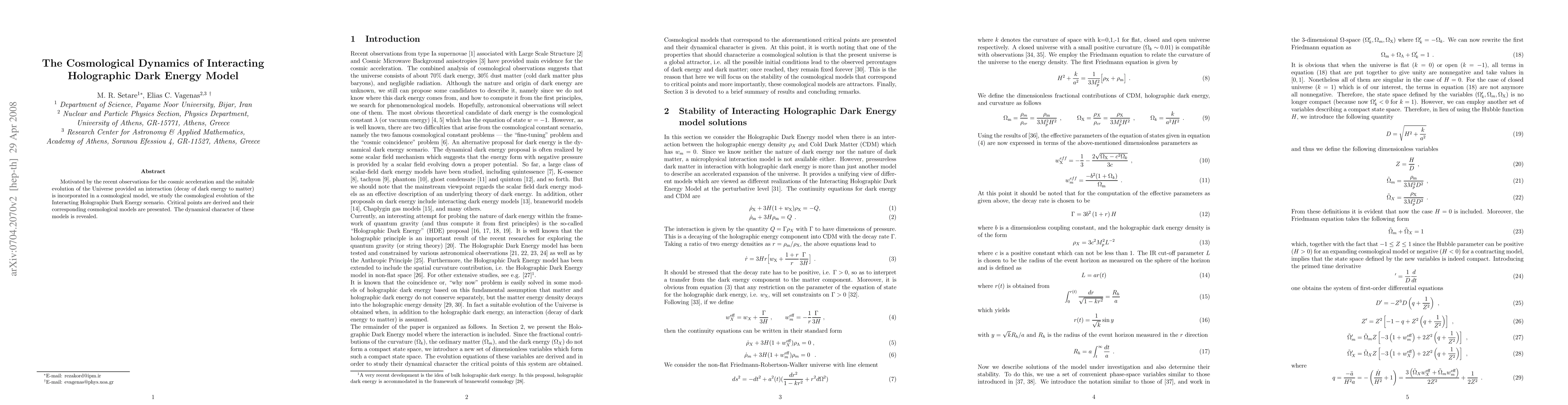 The paper presents a detailed analysis of the cosmological dynamics of the Interacting Holographic Dark Energy model, deriving a system of first-order differential equations and identifying critical points with their dynamical characteristics.
