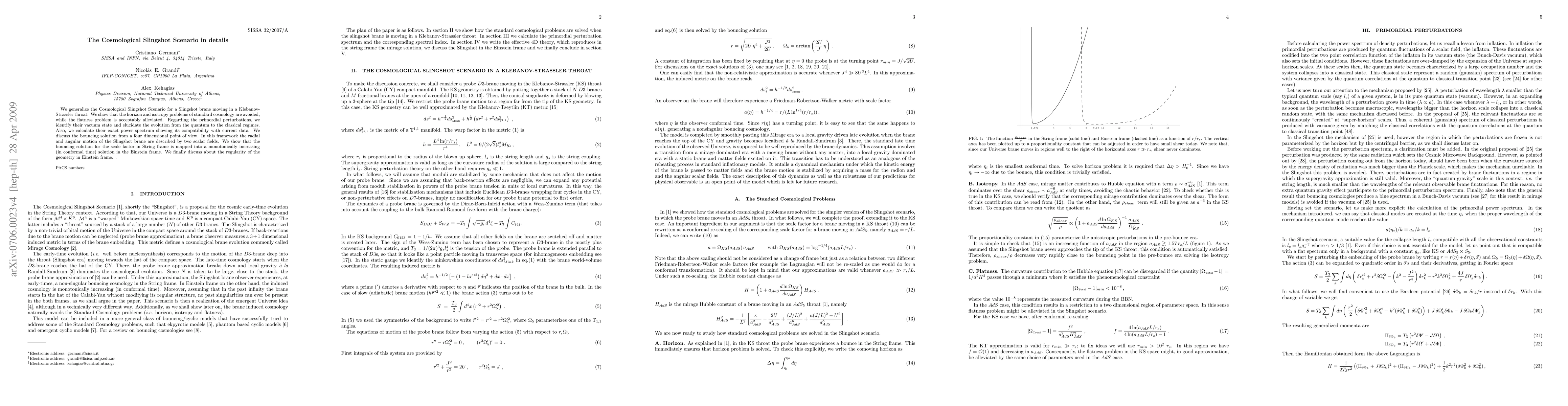 The Cosmological Slingshot Scenario resolves horizon and isotropy problems, while alleviating the flatness problem in a new framework for a Slingshot brane moving through a Klebanov-Strassler throat.