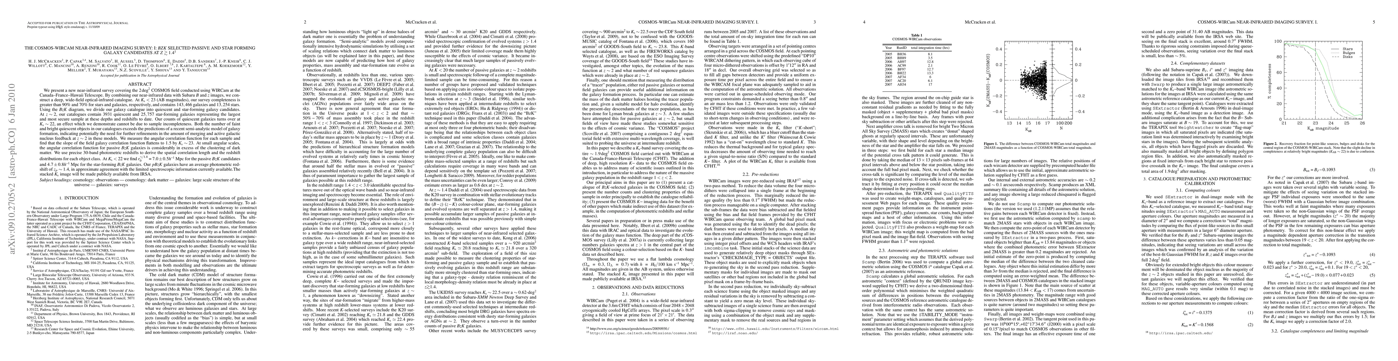 (abridged) We present a new near-infrared survey covering the 2 deg sq COSMOS field. Combining our survey with Subaru B and z images we construct a deep, wide-field optical-infrared catalogue. At Ks<23 (AB magnitudes) our survey completeness is greater than 90% and 70% for stars and galaxies respectively and contains 143,466 galaxies and 13,254 stars. At z~2 our catalogues contain 3931 quiescent and 25,757 star-forming BzK-selected galaxies representing the largest and most secure sample of these objects to date. Our counts of quiescent galaxies turns over at Ks~22 an effect which we demonstrate cannot be due to sample incompleteness. In our survey both the number of faint and bright quiescent objects exceeds the predictions of a semi-analytic galaxy formation model, indicating potentially the need for further refinements in the amount of merging and AGN feedback at z~2 in these models. We measure the angular correlation function for each sample and find that at small scales the correlation function for passive BzK galaxies exceeds the clustering of dark matter. We use 30-band photometric redshifts to derive the spatial correlation length and the redshift distributions for each object class. At Ks<22 we find r_0^{\gamma/1.8}=7.0 +/-0.5h^{-1} Mpc for the passive BzK candidates and 4.7+/-0.8h^{-1} Mpc for the star-forming BzK galaxies. Our pBzK galaxies have an average photometric redshift of z_p~1.4, in approximate agreement with the limited spectroscopic information currently available. The stacked Ks image will be made publicly available from IRSA.