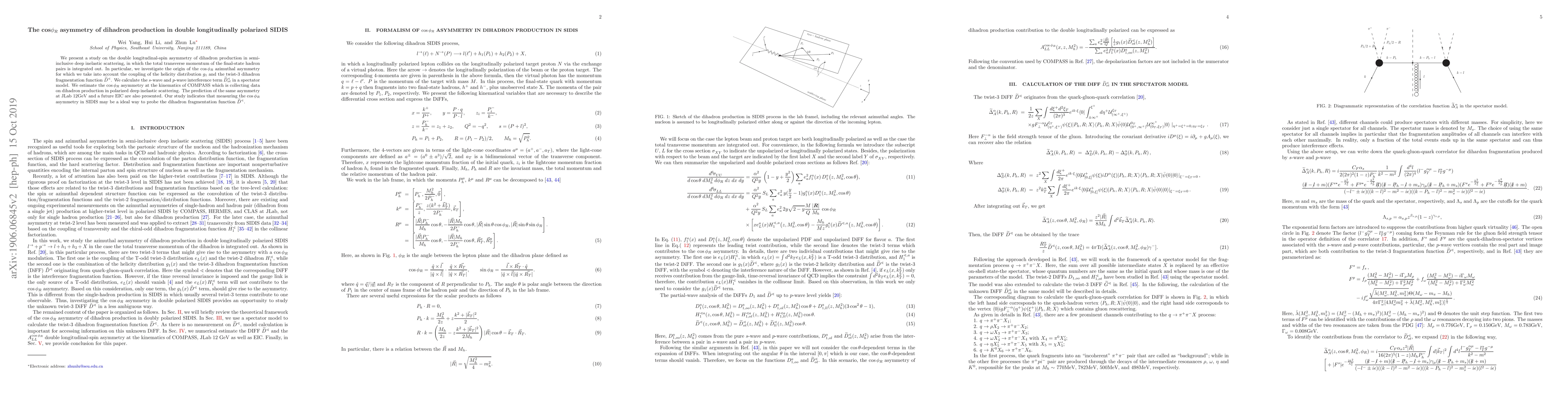 We present a study on the double longitudinal-spin asymmetry of dihadron production in semi-inclusive deep inelastic scattering, in which the total transverse momentum of the final-state hadron pairs is integrated out. In particular, we investigate the origin of the $\cos\phi_R$ azimuthal asymmetry for which we take into account the coupling of the helicity distribution $g_1$ and the twist-3 dihadron fragmentation function $\widetilde{D}^{\sphericalangle}$. We calculate the $s$-wave and $p$-wave interference term $\widetilde{D}^{\sphericalangle}_{ot}$ in a spectator model. We estimate the $\cos\phi_R$ asymmetry at the kinematics of COMPASS which is collecting data on dihadron production in polarized deep inelastic scattering. The prediction of the same asymmetry at JLab 12GeV and a future EIC are also presented. Our study indicates that measuring the $\cos\phi_R$ asymmetry in SIDIS may be a ideal way to probe the dihadron fragmentation function $\widetilde{D}^{\sphericalangle}$.