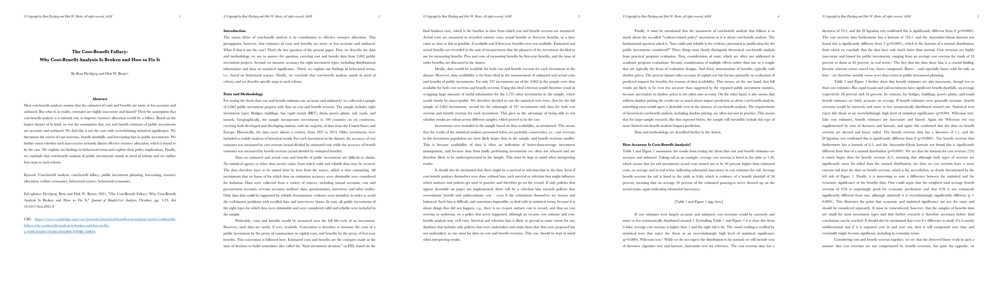 Most cost-benefit analyses assume that the estimates of costs and benefits are more or less accurate and unbiased. But what if, in reality, estimates are highly inaccurate and biased? Then the assumption that cost-benefit analysis is a rational way to improve resource allocation would be a fallacy. Based on the largest dataset of its kind, we test the assumption that cost and benefit estimates of public investments are accurate and unbiased. We find this is not the case with overwhelming statistical significance. We document the extent of cost overruns, benefit shortfalls, and forecasting bias in public investments. We further assess whether such inaccuracies seriously distort effective resource allocation, which is found to be the case. We explain our findings in behavioral terms and explore their policy implications. Finally, we conclude that cost-benefit analysis of public investments stands in need of reform and we outline four steps to such reform.