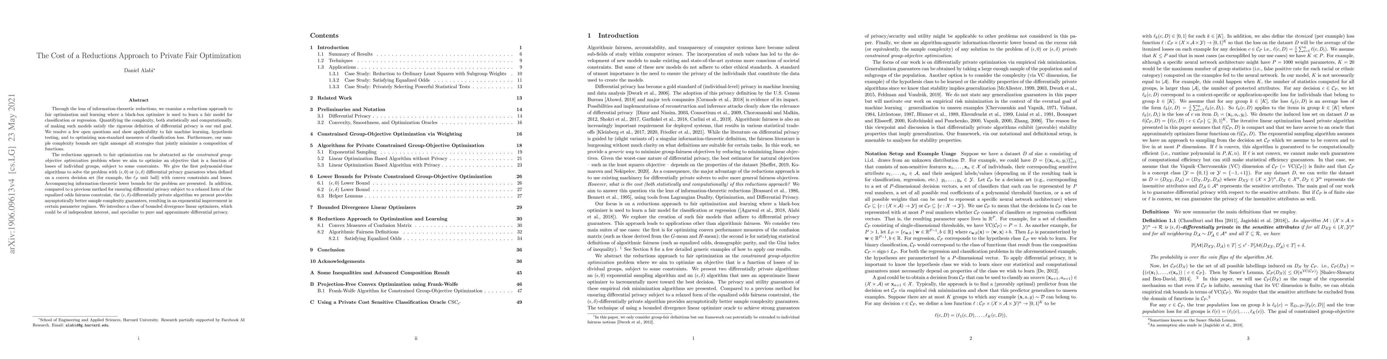 Through the lens of information-theoretic reductions, we examine a reductions approach to fair optimization and learning where a black-box optimizer is used to learn a fair model for classification or regression. Quantifying the complexity, both statistically and computationally, of making such models satisfy the rigorous definition of differential privacy is our end goal. We resolve a few open questions and show applicability to fair machine learning, hypothesis testing, and to optimizing non-standard measures of classification loss. Furthermore, our sample complexity bounds are tight amongst all strategies that jointly minimize a composition of functions. The reductions approach to fair optimization can be abstracted as the constrained group-objective optimization problem where we aim to optimize an objective that is a function of losses of individual groups, subject to some constraints. We give the first polynomial-time algorithms to solve the problem with $(\epsilon, 0)$ or $(\epsilon, \delta)$ differential privacy guarantees when defined on a convex decision set (for example, the $\ell_P$ unit ball) with convex constraints and losses. Accompanying information-theoretic lower bounds for the problem are presented. In addition, compared to a previous method for ensuring differential privacy subject to a relaxed form of the equalized odds fairness constraint, the $(\epsilon, \delta)$-differentially private algorithm we present provides asymptotically better sample complexity guarantees, resulting in an exponential improvement in certain parameter regimes. We introduce a class of bounded divergence linear optimizers, which could be of independent interest, and specialize to pure and approximate differential privacy.
