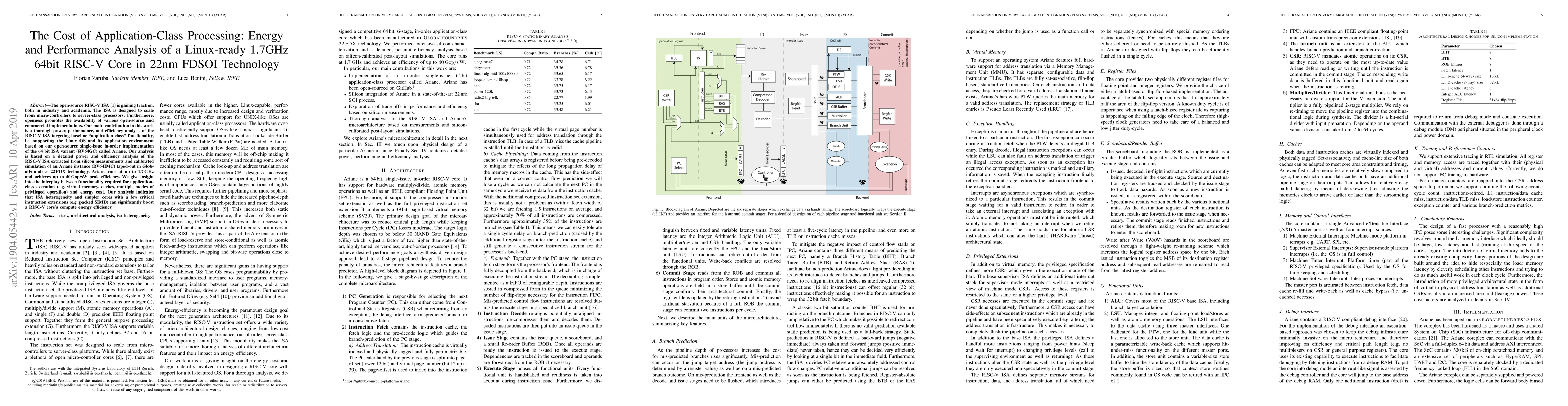 This paper conducts a detailed power, performance, and efficiency analysis of a 1.7GHz 64-bit RISC-V core designed for application-class processing on Linux, revealing significant gains in efficiency through ISA heterogeneity and specific instruction extensions. The study shows that the core achieves up to 40 Gop/sW peak efficiency, highlighting the energy cost interplay with application-class functionality.