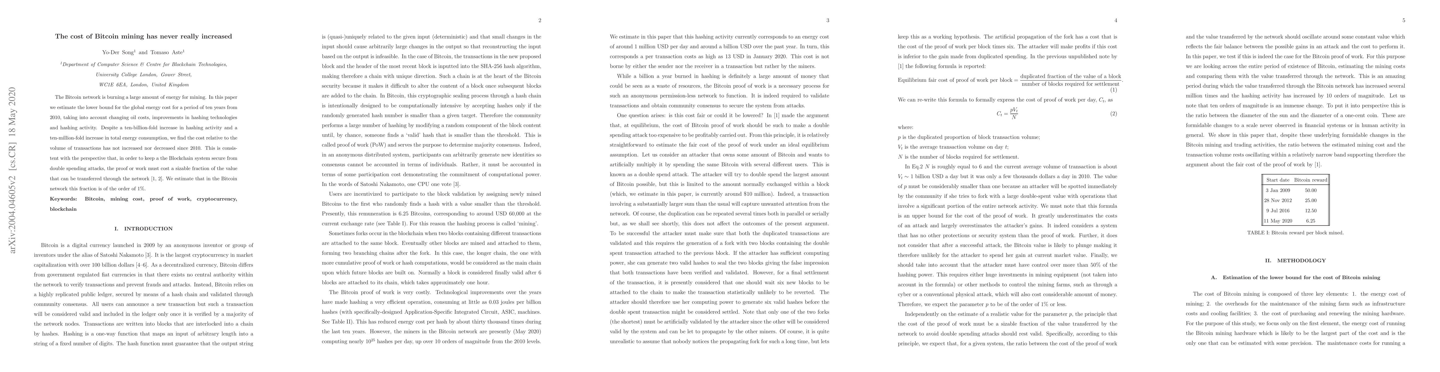 The Bitcoin network is burning a large amount of energy for mining. In this paper we estimate the lower bound for the global energy cost for a period of ten years from 2010, taking into account changing oil costs, improvements in hashing technologies and hashing activity. Despite a ten-billion-fold increase in hashing activity and a ten-million-fold increase in total energy consumption, we find the cost relative to the volume of transactions has not increased nor decreased since 2010. This is consistent with the perspective that, in order to keep a the Blockchain system secure from double spending attacks, the proof or work must cost a sizable fraction of the value that can be transferred through the network. We estimate that in the Bitcoin network this fraction is of the order of 1%.