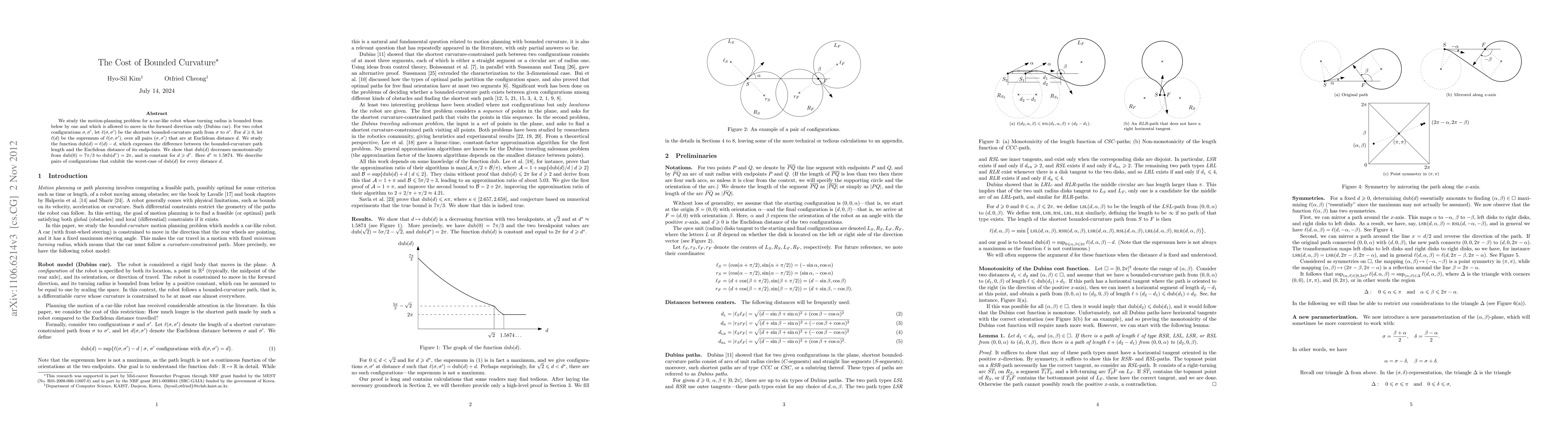 Researchers studied a car-like robot's motion-planning problem with bounded curvature and found that the difference between path length and Euclidean distance decreases from 7π/3 to 2π as distance increases.