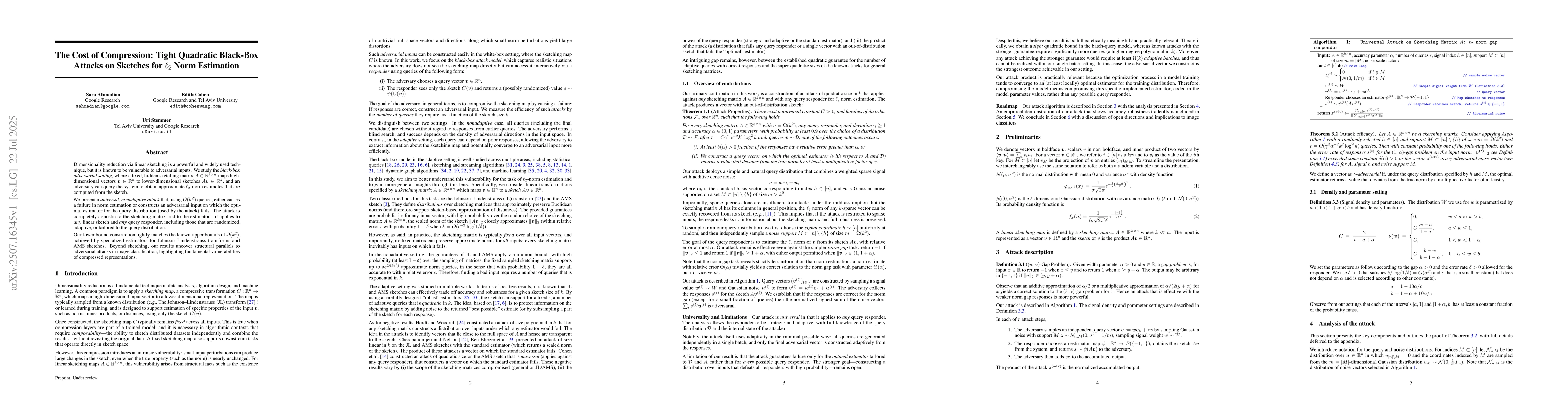 The research distinguishes itself by presenting a tight quadratic lower bound for black-box attacks on sketching matrices, which matches known upper bounds, and by drawing parallels to adversarial attacks in image classification, thereby highlighting fundamental vulnerabilities in compressed representations.