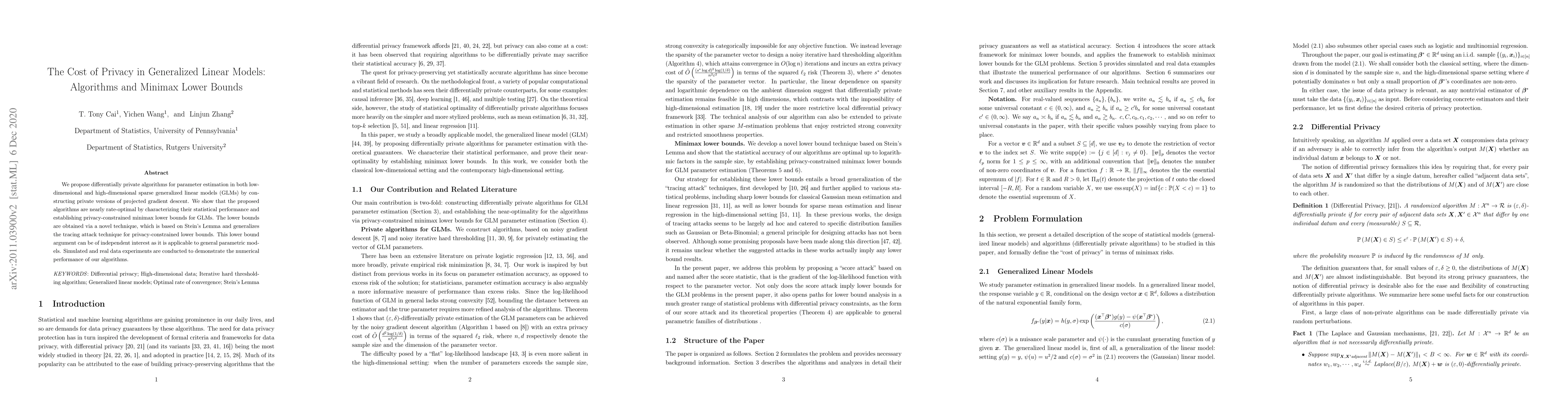 This paper proposes differentially private algorithms for parameter estimation in generalized linear models, demonstrating their near-optimality through statistical performance analysis and establishing privacy-constrained minimax lower bounds using a novel technique based on Stein's Lemma. Experiments show the practical effectiveness of the proposed methods.
