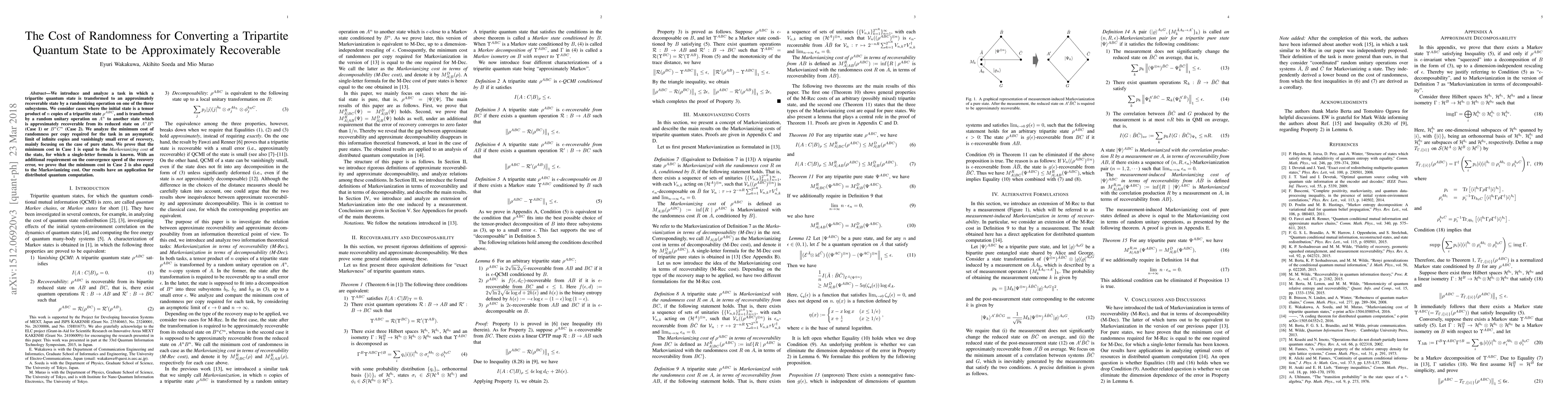 We introduce and analyze a task in which a tripartite quantum state is transformed to an approximately recoverable state by a randomizing operation on one of the three subsystems. We consider cases where the initial state is a tensor product of $n$ copies of a tripartite state $\rho^{ABC}$, and is transformed by a random unitary operation on $A^n$ to another state which is approximately recoverable from its reduced state on $A^nB^n$ (Case 1) or $B^nC^n$ (Case 2). We analyze the minimum cost of randomness per copy required for the task in an asymptotic limit of infinite copies and vanishingly small error of recovery, mainly focusing on the case of pure states. We prove that the minimum cost in Case 1 is equal to the Markovianizing cost of the state, for which a single-letter formula is known. With an additional requirement on the convergence speed of the recovery error, we prove that the minimum cost in Case 2 is also equal to the Markovianizing cost. Our results have an application for distributed quantum computation.