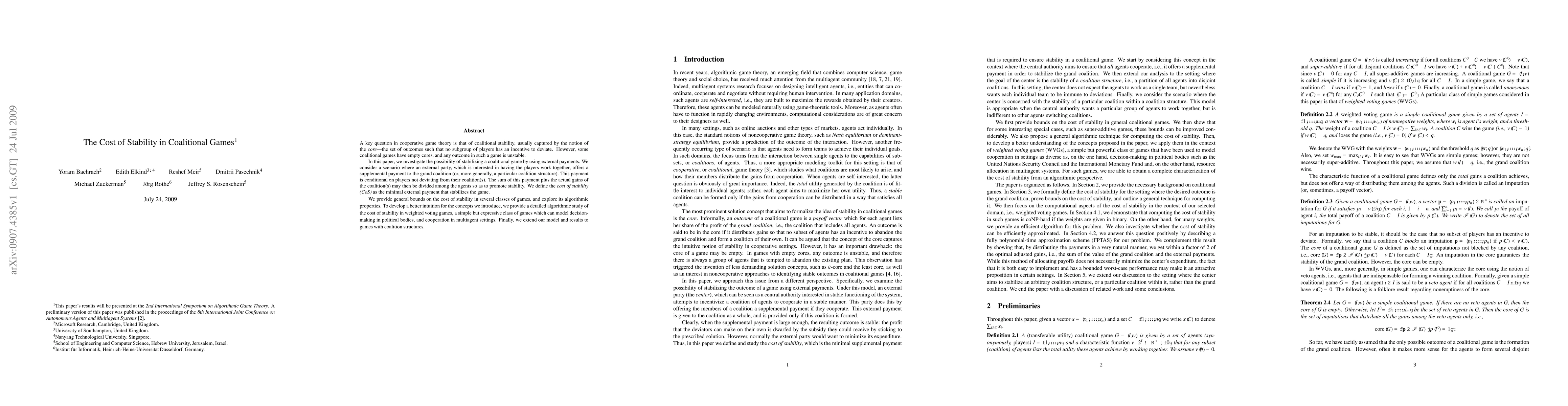 This paper explores the concept of stabilizing coalitional games through external payments, defining the "cost of stability" as the minimal payment needed to ensure no subgroup of players has an incentive to deviate. The authors provide general bounds and algorithmic insights into this cost, particularly in weighted voting games, and extend their findings to more complex games with predefined coalition structures.