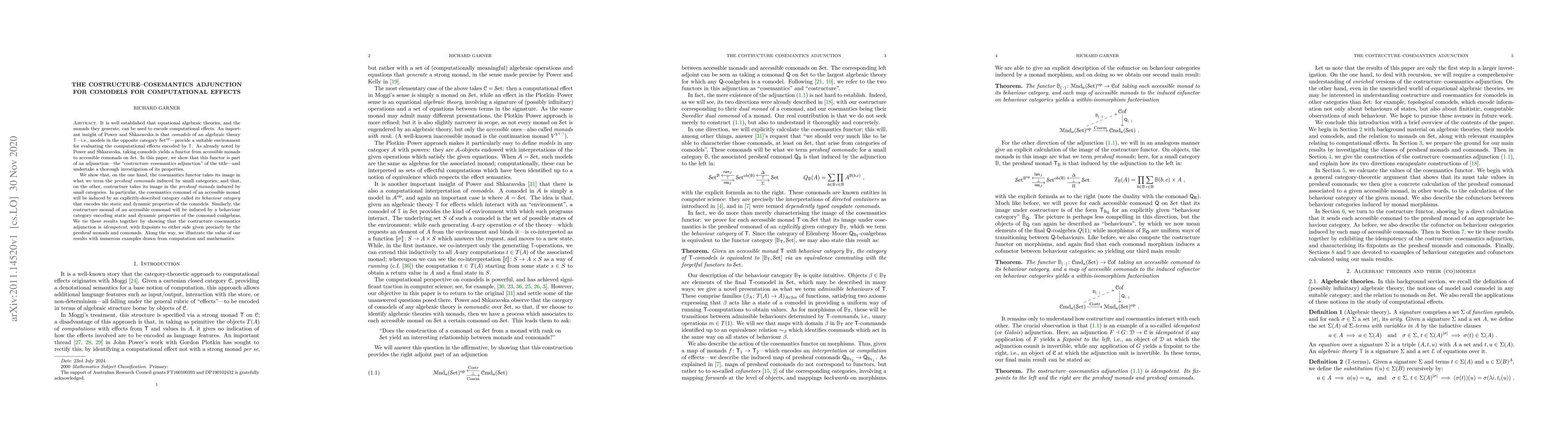 It is well established that equational algebraic theories, and the monads they generate, can be used to encode computational effects. An important insight of Power and Shkaravska is that comodels of an algebraic theory T -- i.e., models in the opposite category Set^op -- provide a suitable environment for evaluating the computational effects encoded by T. As already noted by Power and Shkaravska, taking comodels yields a functor from accessible monads to accessible comonads on Set. In this paper, we show that this functor is part of an adjunction -- the "costructure-cosemantics adjunction" of the title -- and undertake a thorough investigation of its properties. We show that, on the one hand, the cosemantics functor takes its image in what we term the presheaf comonads induced by small categories; and that, on the other, costructure takes its image in the presheaf monads induced by small categories. In particular, the cosemantics comonad of an accessible monad will be induced by an explicitly-described category called its behaviour category that encodes the static and dynamic properties of the comodels. Similarly, the costructure monad of an accessible comonad will be induced by a behaviour category encoding static and dynamic properties of the comonad coalgebras. We tie these results together by showing that the costructure-cosemantics adjunction is idempotent, with fixpoints to either side given precisely by the presheaf monads and comonads. Along the way, we illustrate the value of our results with numerous examples drawn from computation and mathematics.