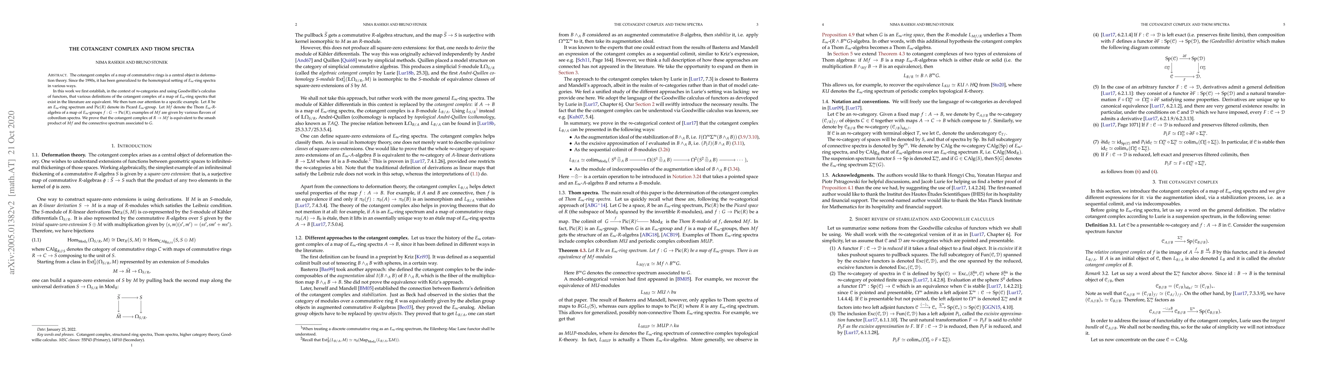 This paper establishes the equivalence of various definitions of the cotangent complex for maps of $E_\infty$-ring spectra within the framework of $\infty$-categories and Goodwillie calculus. It further shows that the cotangent complex for a map from an $E_\infty$-ring spectrum $R$ to a Thom spectrum $Mf$ of a map between $E_\infty$-groups is equivalent to the smash product of $Mf$ and the connective spectrum associated with $G$.