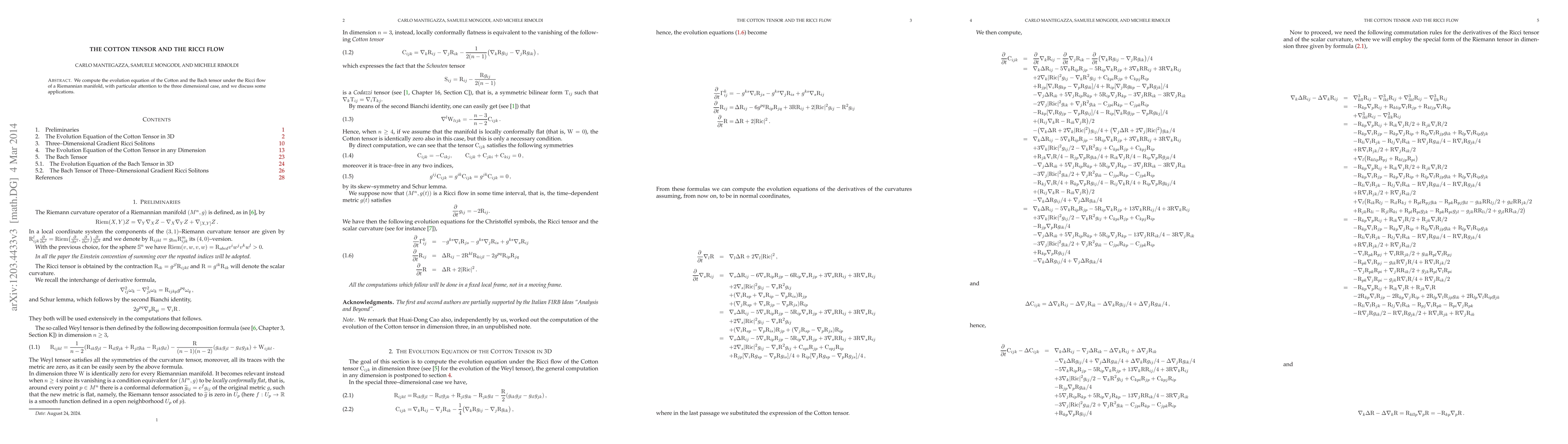 This paper derives the evolution equations for the Cotton and Bach tensors under Ricci flow on Riemannian manifolds, focusing on three-dimensional cases, and explores their potential applications in geometric analysis.