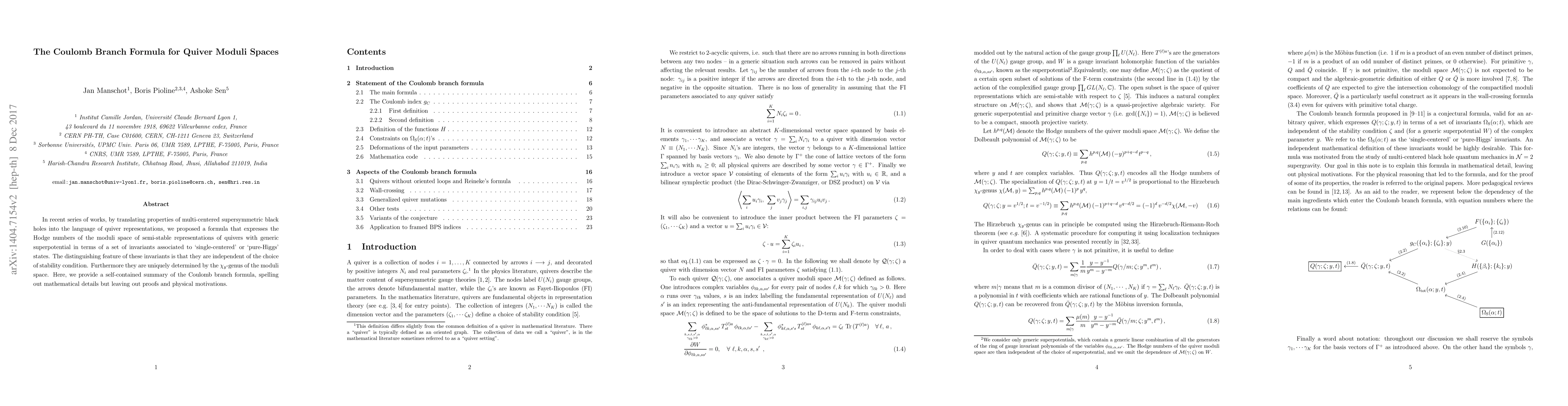 In recent series of works, by translating properties of multi-centered supersymmetric black holes into the language of quiver representations, we proposed a formula that expresses the Hodge numbers of the moduli space of semi-stable representations of quivers with generic superpotential in terms of a set of invariants associated to `single-centered' or `pure-Higgs' states. The distinguishing feature of these invariants is that they are independent of the choice of stability condition. Furthermore they are uniquely determined by the $\chi_y$-genus of the moduli space. Here, we provide a self-contained summary of the Coulomb branch formula, spelling out mathematical details but leaving out proofs and physical motivations.