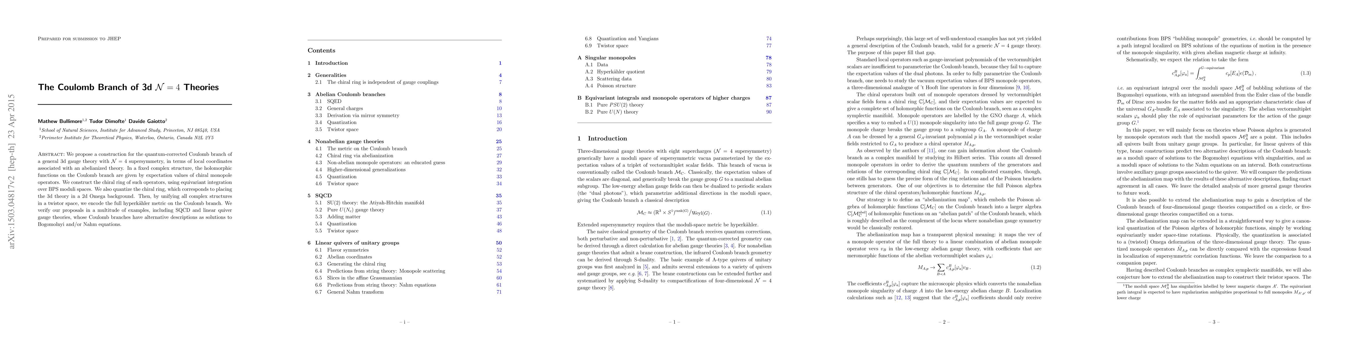 We propose a construction of the quantum-corrected Coulomb branch of a general 3d gauge theory with $\mathcal{N}=4$ supersymmetry, in terms of local coordinates associated with an abelianized theory. In a fixed complex structure, the holomorphic functions on the Coulomb branch are given by expectation values of chiral monopole operators. We construct the chiral ring of such operators, using equivariant integration over BPS moduli spaces. We also quantize the chiral ring, which corresponds to placing the 3d theory in a 2d Omega background. Then, by unifying all complex structures in a twistor space, we encode the full hyperk\"ahler metric on the Coulomb branch. We verify our proposals in a multitude of examples, including SQCD and linear quiver gauge theories, whose Coulomb branches have alternative descriptions as solutions to the Bogomolnyi and/or Nahm equations.
