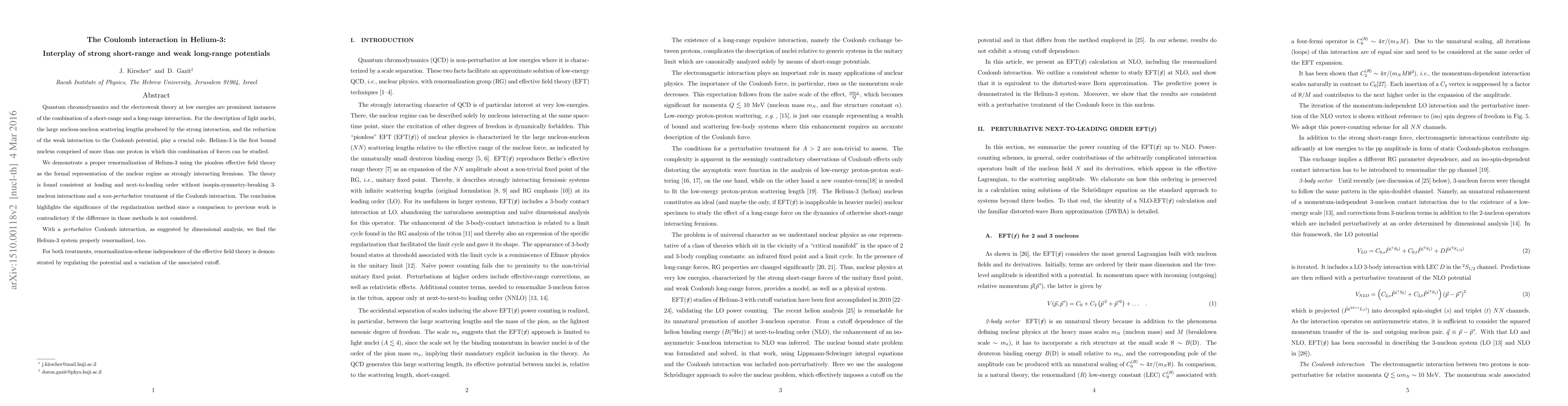 This paper investigates the Coulomb interaction in Helium-3, emphasizing the interplay between strong short-range and weak long-range forces. It demonstrates the renormalization of Helium-3 using pionless effective field theory, showing consistency at leading and next-to-leading order, and highlights the importance of regularization methods for accurate comparisons.