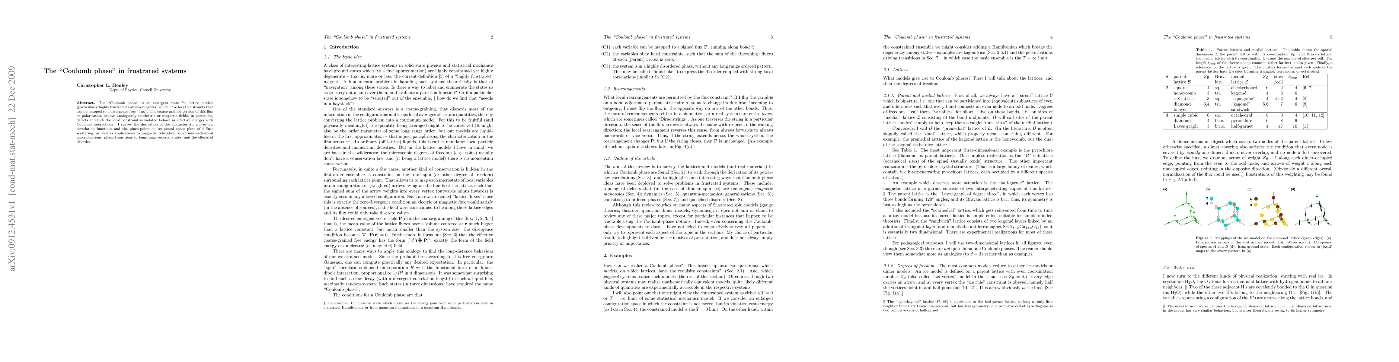 The "Coulomb phase" is an emergent state for lattice models (particularly highly frustrated antiferromagnets) which have local constraints that can be mapped to a divergence-free "flux". The coarse-grained version of this flux or polarization behave analogously to electric or magnetic fields; in particular, defects at which the local constraint is violated behave as effective charges with Coulomb interactions. I survey the derivation of the characteristic power-law correlation functions and the pinch-points in reciprocal space plots of diffuse scattering, as well as applications to magnetic relaxation, quantum-mechanical generalizations, phase transitions to long-range-ordered states, and the effects of disorder.