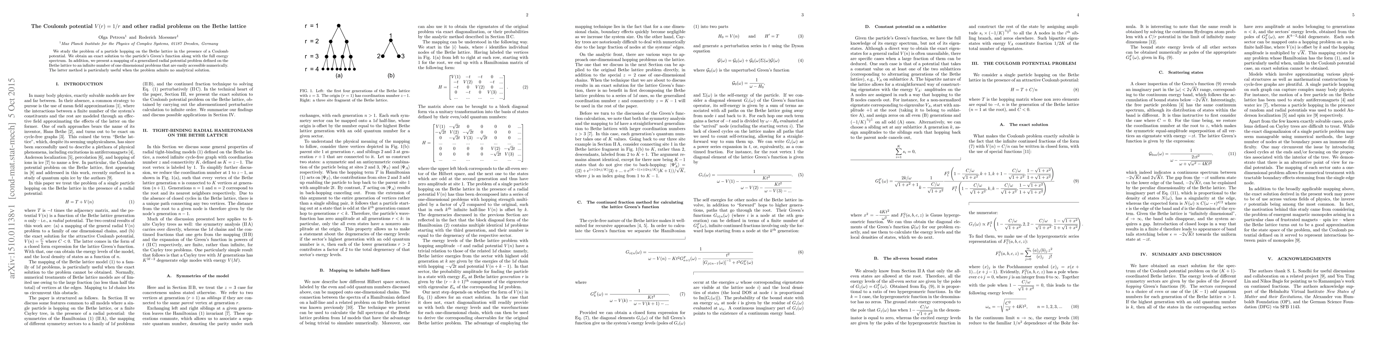 Researchers solved a problem involving a particle on the Bethe lattice with a Coulomb potential, finding an exact solution to its Green's function and energy spectrum. They also developed a method to map related problems to easily solvable one-dimensional problems.