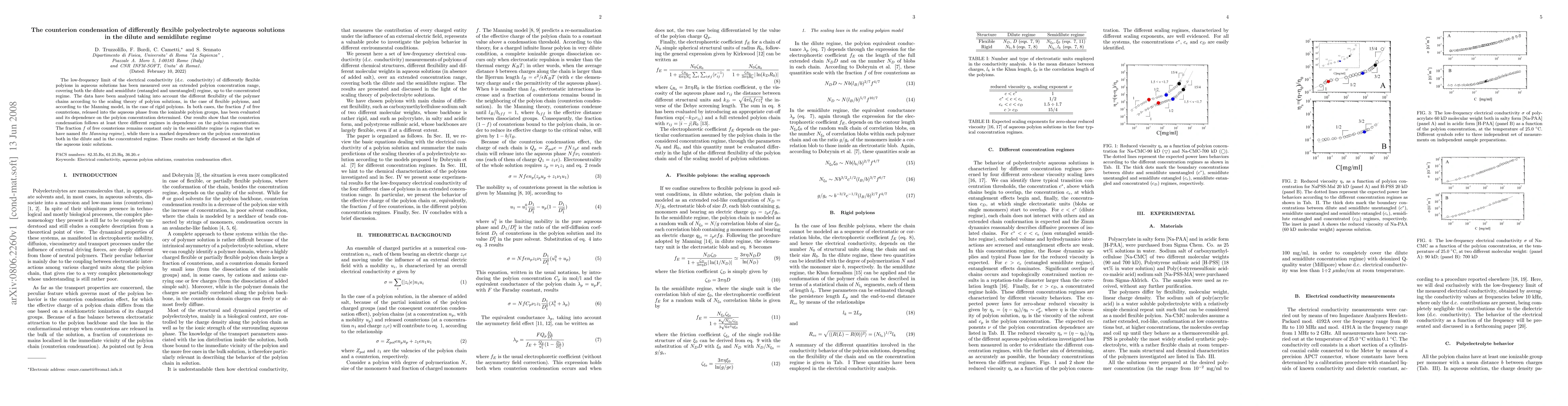 The low-frequency limit of the electrical conductivity (d.c. conductivity) of differently flexible polyions in aqueous solutions has been measured over an extended polyion concentration range, covering both the dilute and semidilute (entangled and unentangled) regime, up to the concentrated regime. The data have been analyzed taking into account the different flexibility of the polymer chains according to the scaling theory of polyion solutions, in the case of flexible polyions, and according to the Manning model, in the case of rigid polyions. In both cases, the fraction f of free counterions, released into the aqueous phase from the ionizable polyion groups, has been evaluated and its dependence on the polyion concentration determined. Our results show that the counterion condensation follows at least three different regimes in dependence on the polyion concentration. The fraction f of free counterions remains constant only in the semidilute regime (a region that we have named the Manning regime), while there is a marked dependence on the polyion concentration both in the dilute and in the concentrated regime. These results are briefly discussed at the light of the aqueous ionic solutions.