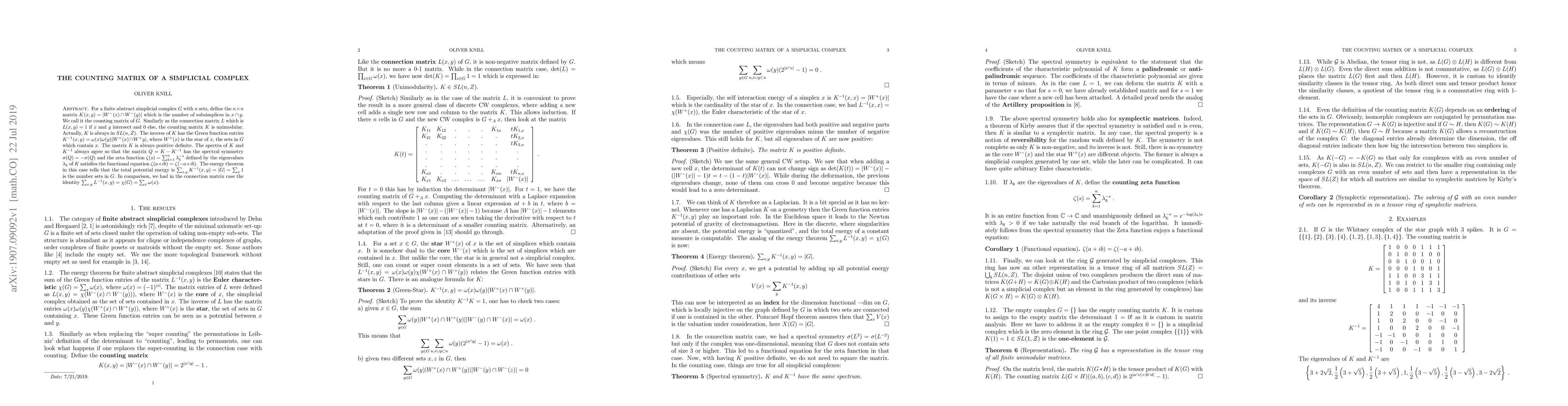 For a finite abstract simplicial complex G with n sets, define the n x n matrix K(x,y) which is the number of subsimplices in the intersection of x and y. We call it the counting matrix of G. Similarly as the connection matrix L which is L(x,y)=1 if x and y intersect and 0 else, the counting matrix K is unimodular. Actually, K is always in SL(n,Z). The inverse of K has the Green function entries K^(-1)(x,y)=w(x) w(y) |W^+(x) intersected W^+y|, where W^+(x) is the star of x, the sets in G which contain x and w(x)=(-1)^dim(x). The matrix K is always positive definite. The spectra of K and K^(-1) always agree so that the matrix Q=K-K^(-1) has the spectral symmetry spec(Q)=-spec(Q) and the zeta function z(s) summing l(k)^(-s) with eigenvalues l(k) of K satisfies the functional equation z(a+ib)=z(-a+ib). The energy theorem in this case tells that the sum of the matrix elements of K^(-1)(x,y) is equal to the number sets in G. In comparison, we had in the connection matrix case the identity that the sum of the matrix elements of L^(-1) is the Euler characteristic of G.