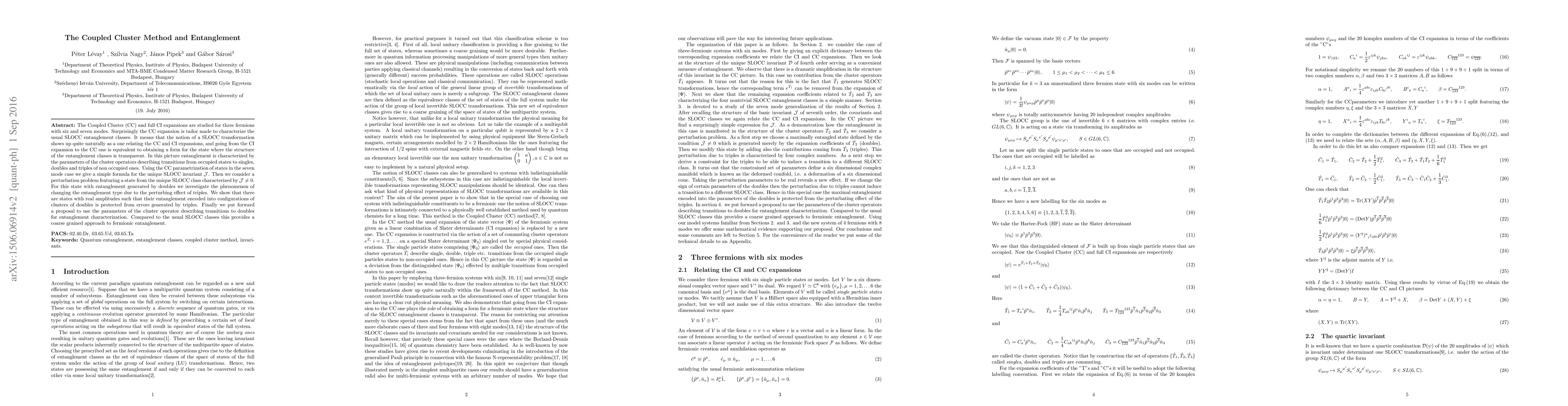 The Coupled Cluster (CC) and full CI expansions are studied for three fermions with six and seven modes. Surprisingly the CC expansion is tailor made to characterize the usual SLOCC entanglement classes. It means that the notion of a SLOCC transformation shows up quite naturally as a one relating the CC and CI expansions, and going from the CI expansion to the CC one is equivalent to obtaining a form for the state where the structure of the entanglement classes is transparent. In this picture entanglement is characterized by the parameters of the cluster operators describing transitions from occupied states to singles, doubles and triples of non occupied ones. Using the CC parametrization of states in the seven mode case we give a simple formula for the unique SLOCC invariant $\mathcal{J}$. Then we consider a perturbation problem featuring a state from the unique SLOCC class characterized by $\mathcal{J}\neq 0$. For this state with entanglement generated by doubles we investigate the phenomenon of changing the entanglement type due to the perturbing effect of triples. We show that there are states with real amplitudes such that their entanglement encoded into configurations of clusters of doubles is protected from errors generated by triples. Finally we put forward a proposal to use the parameters of the cluster operator describing transitions to doubles for entanglement characterization. Compared to the usual SLOCC classes this provides a coarse grained approach to fermionic entanglement.