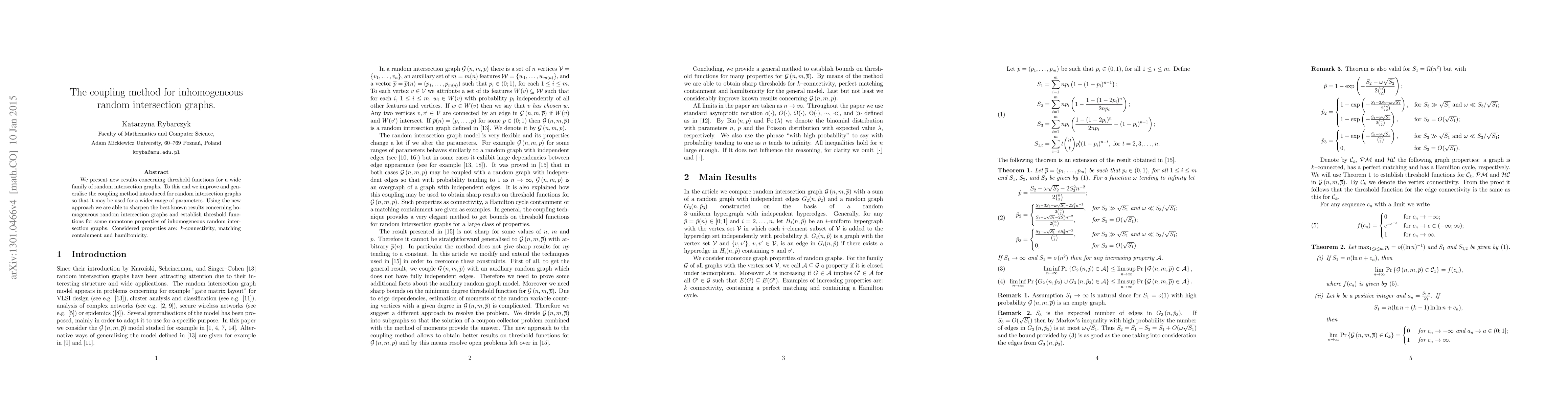 This paper introduces a modified coupling method for determining threshold functions in inhomogeneous random intersection graphs, extending previous results for homogeneous graphs. The new approach establishes threshold functions for properties like $k$-connectivity, matching containment, and hamiltonicity, and improves upon existing results for homogeneous graphs.