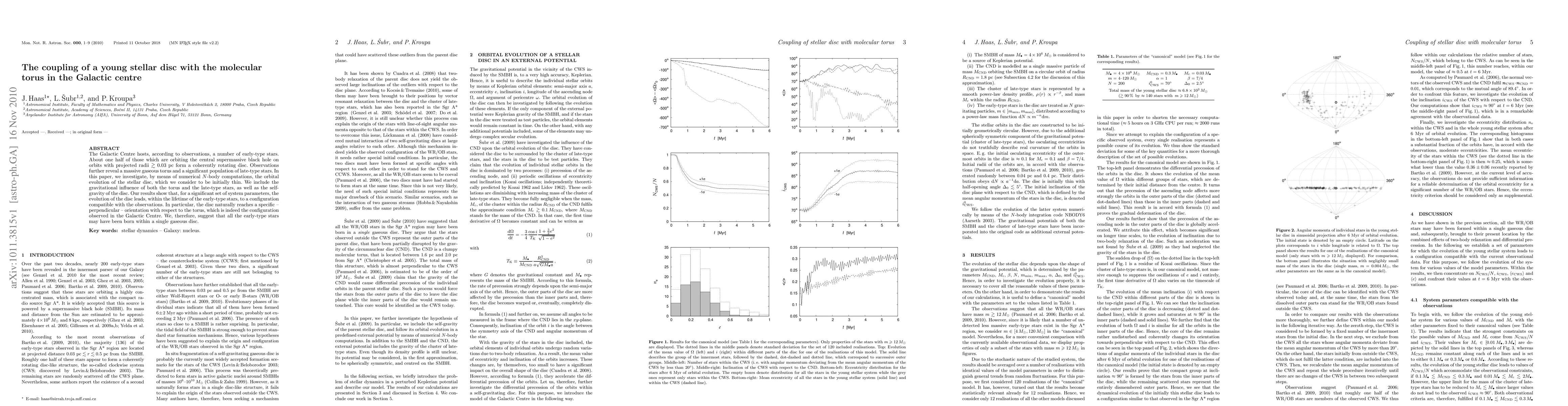 This paper uses numerical N-body computations to explore the orbital evolution of a young stellar disc in the Galactic centre, considering the gravitational influences of a gaseous torus and late-type stars. The results suggest that the disc's evolution leads to an observed perpendicular orientation with respect to the torus, supporting the hypothesis that early-type stars formed within a single gaseous disc.