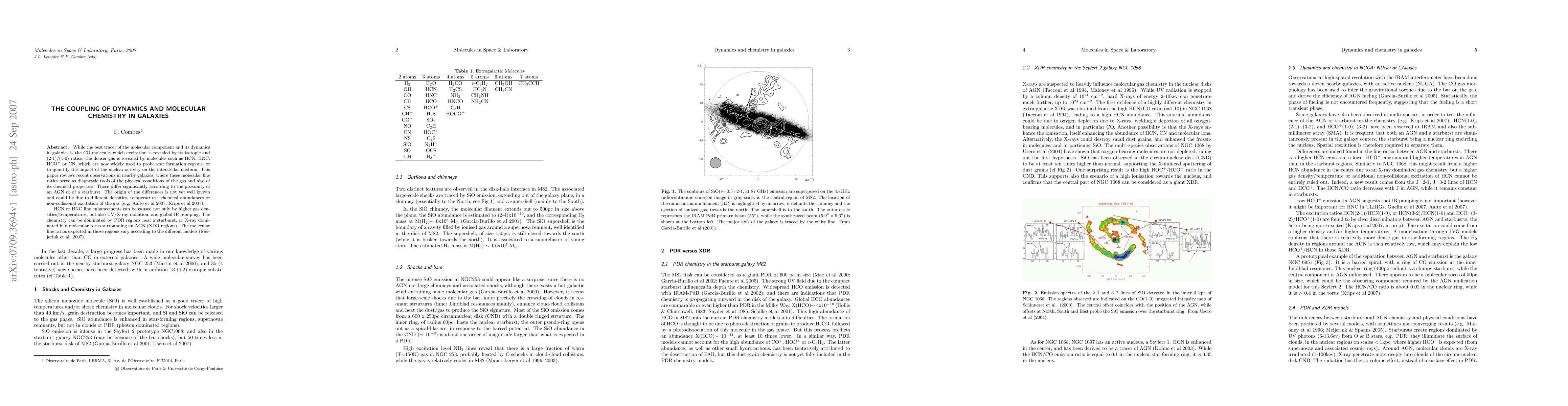 While the best tracer of the molecular component and its dynamics in galaxies is the CO molecule, which excitation is revealed by its isotopic and (2-1)/(1-0) ratios, the denser gas is revealed by molecules such as HCN, HNC, HCO+ or CN, which are now widely used to probe star formation regions, or to quantify the impact of the nuclear activity on the interstellar medium. This paper reviews recent observations in nearby galaxies, where these molecular line ratios serve as diagnostic tools of the physical conditions of the gas and also of its chemical properties. Those differ significantly according to the proximity of an AGN or of a starburst. The origin of the differences is not yet well known and could be due to different densities, temperatures, chemical abundances or non-collisional excitation of the gas (e.g. Aalto et al 2007, Krips et al 2007). HCN or HNC line enhancements can be caused not only by higher gas densities/temperatures, but also UV/X-ray radiation, and global IR pumping. The chemistry can be dominated by PDR regions near a starburst, or X-ray dominated in a molecular torus surrounding an AGN (XDR regions). The molecular line ratios expected in those regions vary according to the different models (Meijerink et al. 2007).