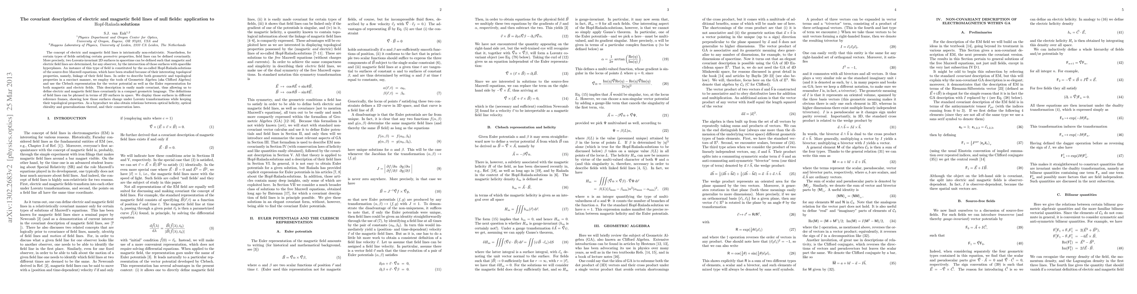 The concept of electric and magnetic field lines is intrinsically non-relativistic. Nonetheless, for certain types of fields satisfying certain geometric properties, field lines can be defined covariantly. More precisely, two Lorentz-invariant 2D surfaces in spacetime can be defined such that magnetic and electric field lines are determined, for any observer, by the intersection of those surfaces with spacelike hyperplanes. An instance of this type of field is constituted by the so-called Hopf-Ranada solutions of the source-free Maxwell equations, which have been studied because of their interesting topological properties, namely, linkage of their field lines. In order to describe both geometric and topological properties in a succinct manner, we employ the tools of Geometric Algebra (aka Clifford Algebra) and use the Clebsch representation for the vector potential as well as the Euler representation for both magnetic and electric fields. This description is easily made covariant, thus allowing us to define electric and magnetic field lines covariantly in a compact geometric language. The definitions of field lines can be phrased in terms of 2D surfaces in space. We display those surfaces in different reference frames, showing how those surfaces change under Lorentz transformations while keeping their topological properties. As a byproduct we also obtain relations between optical helicity, optical chirality and generalizations thereof, and their conservation laws.