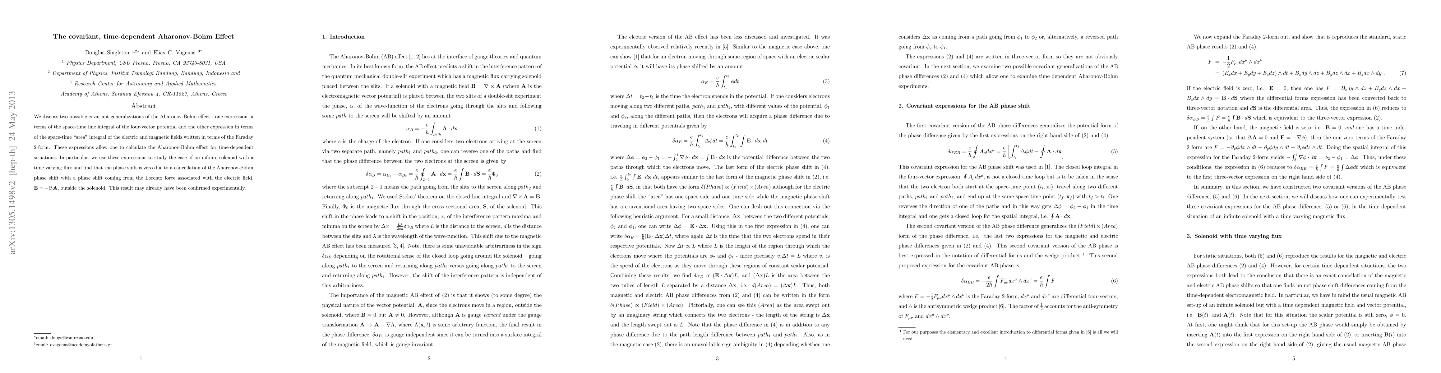 We discuss two possible covariant generalizations of the Aharonov-Bohm effect - one expression in terms of the space-time line integral of the four-vector potential and the other expression in terms of the space-time "area" integral of the electric and magnetic fields written in terms of the Faraday 2-form. These expressions allow one to calculate the Aharonov-Bohm effect for time-dependent situations. In particular, we use these expressions to study the case of an infinite solenoid with a time varying flux and find that the phase shift is zero due to a cancellation of the Aharonov-Bohm phase shift with a phase shift coming from the Lorentz force associated with the electric field, ${\bf E} = - \partial_t {\bf A}$, outside the solenoid. This result may already have been confirmed experimentally.