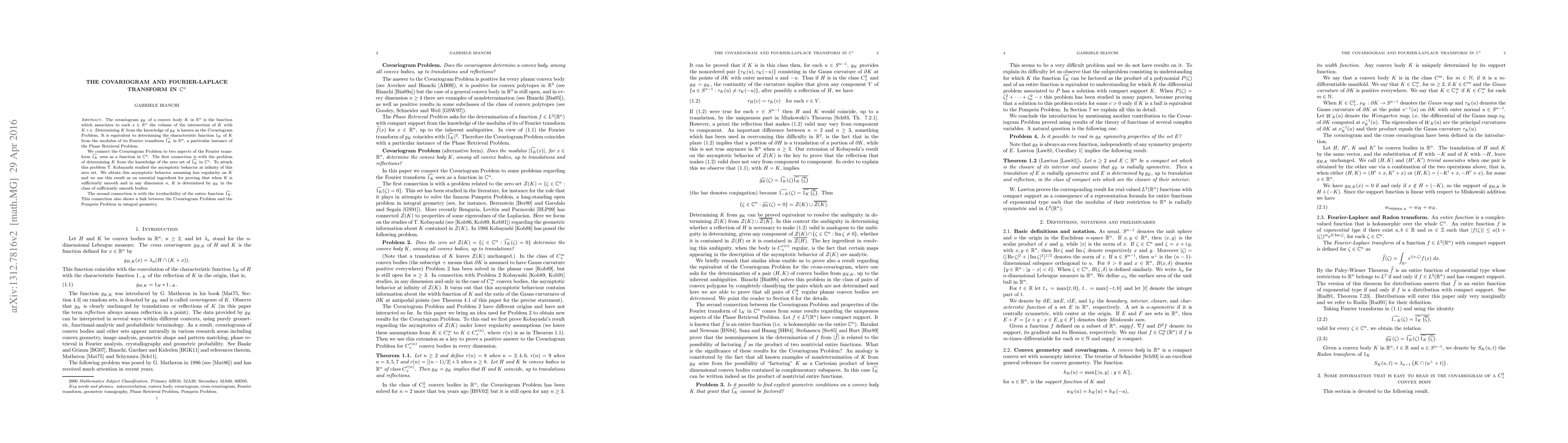The paper investigates the Covariogram Problem in $\mathbb{R}^n$, connecting it to Fourier transform properties in $\mathbb{C}^n$ and determining convex bodies $K$ from their covariograms $g_K$. It proves that $K$ can be uniquely identified by $g_K$ for sufficiently smooth bodies, leveraging the zero set's asymptotic behavior and the irreducibility of the Fourier transform's entire function.