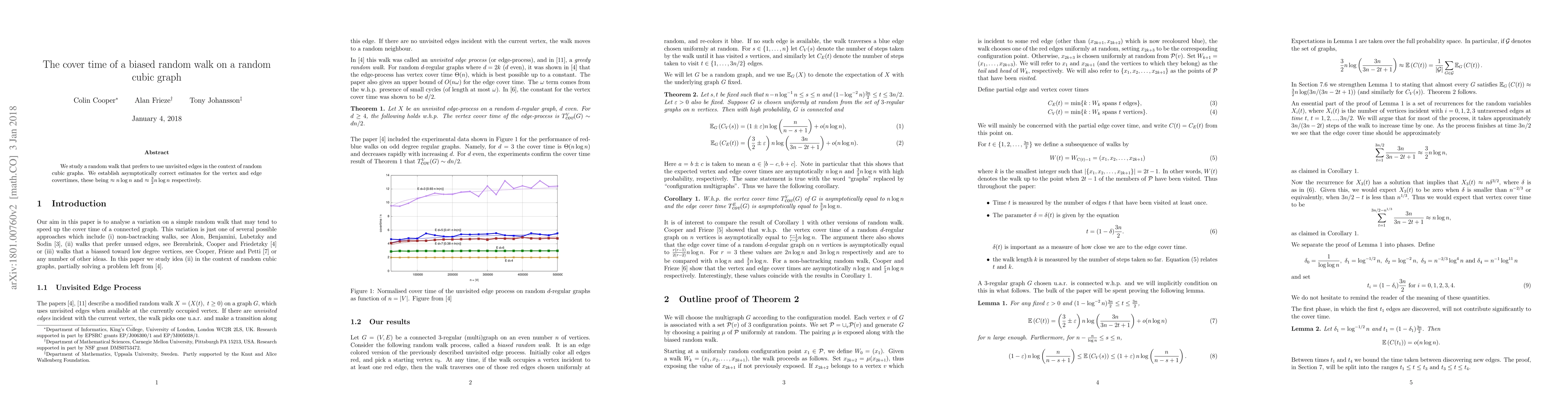 A biased random walk on a random cubic graph shows vertex cover time approximately nlogn and edge cover time approximately 3/2nlogn.