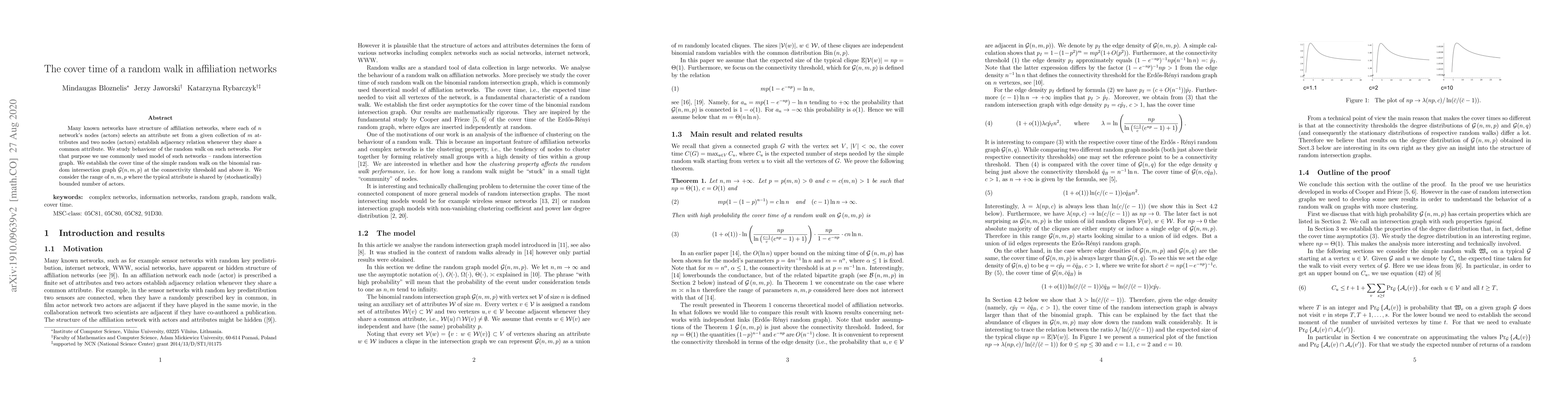 Many known networks have structure of affiliation networks, where each of $n$ network's nodes (actors) selects an attribute set from a given collection of $m$ attributes and two nodes (actors) establish adjacency relation whenever they share a common attribute. We study behaviour of the random walk on such networks. For that purpose we use commonly used model of such networks -- random intersection graph. We establish the cover time of the simple random walk on the binomial random intersection graph ${\cal G}(n,m,p)$ at the connectivity threshold and above it. We consider the range of $n,m,p$ where the typical attribute is shared by (stochastically) bounded number of actors.