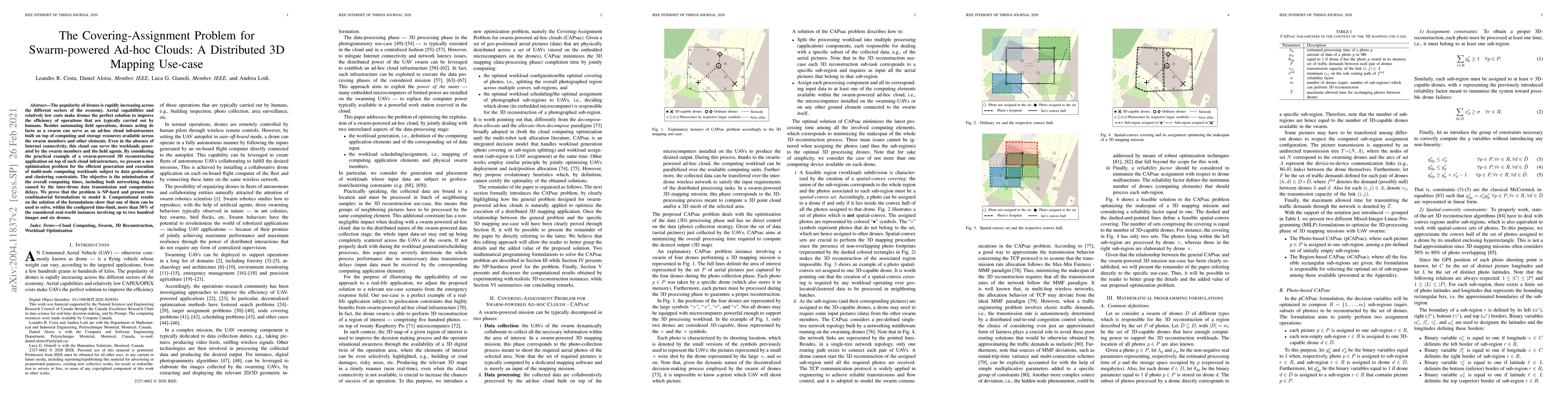 The popularity of drones is rapidly increasing across the different sectors of the economy. Aerial capabilities and relatively low costs make drones the perfect solution to improve the efficiency of those operations that are typically carried out by humans (e.g., building inspection, photo collection). The potential of drone applications can be pushed even further when they are operated in fleets and in a fully autonomous manner, acting de facto as a drone swarm. Besides automating field operations, a drone swarm can serve as an ad-hoc cloud infrastructure built on top of computing and storage resources available across the swarm members and other connected elements. Even in the absence of Internet connectivity, this cloud can serve the workloads generated by the swarm members themselves, as well as by the field agents operating within the area of interest. By considering the practical example of a swarm-powered 3D reconstruction application, we present a new optimization problem for the efficient generation and execution, on top of swarm-powered ad-hoc cloud infrastructure, of multi-node computing workloads subject to data geolocation and clustering constraints. The objective is the minimization of the overall computing times, including both networking delays caused by the inter-drone data transmission and computation delays. We prove that the problem is NP-hard and present two combinatorial formulations to model it. Computational results on the solution of the formulations show that one of them can be used to solve, within the configured time-limit, more than 50% of the considered real-world instances involving up to two hundred images and six drones.
