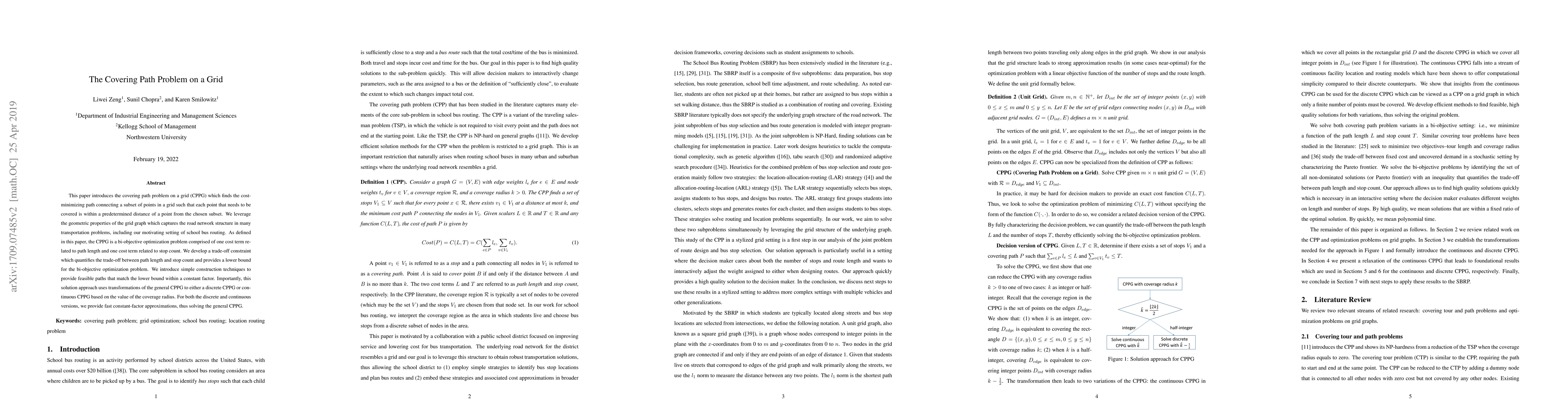 This paper introduces the covering path problem on a grid (CPPG) which finds the cost-minimizing path connecting a subset of points in a grid such that each point that needs to be covered is within a predetermined distance of a point from the chosen subset. We leverage the geometric properties of the grid graph which captures the road network structure in many transportation problems, including our motivating setting of school bus routing. As defined in this paper, the CPPG is a bi-objective optimization problem comprised of one cost term related to path length and one cost term related to stop count. We develop a trade-off constraint which quantifies the trade-off between path length and stop count and provides a lower bound for the bi-objective optimization problem. We introduce simple construction techniques to provide feasible paths that match the lower bound within a constant factor. Importantly, this solution approach uses transformations of the general CPPG to either a discrete CPPG or continuous CPPG based on the value of the coverage radius. For both the discrete and continuous versions, we provide fast constant-factor approximations, thus solving the general CPPG.