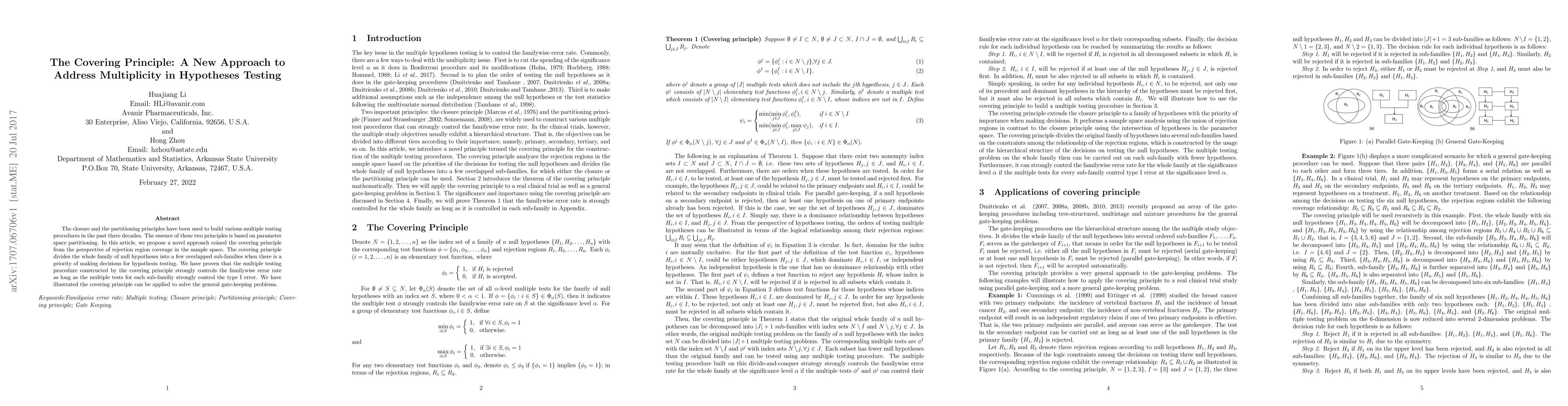 A new approach, called the covering principle, is proposed to address multiplicity in hypotheses testing by dividing null hypotheses into overlapping sub-families to control familywise error rates.