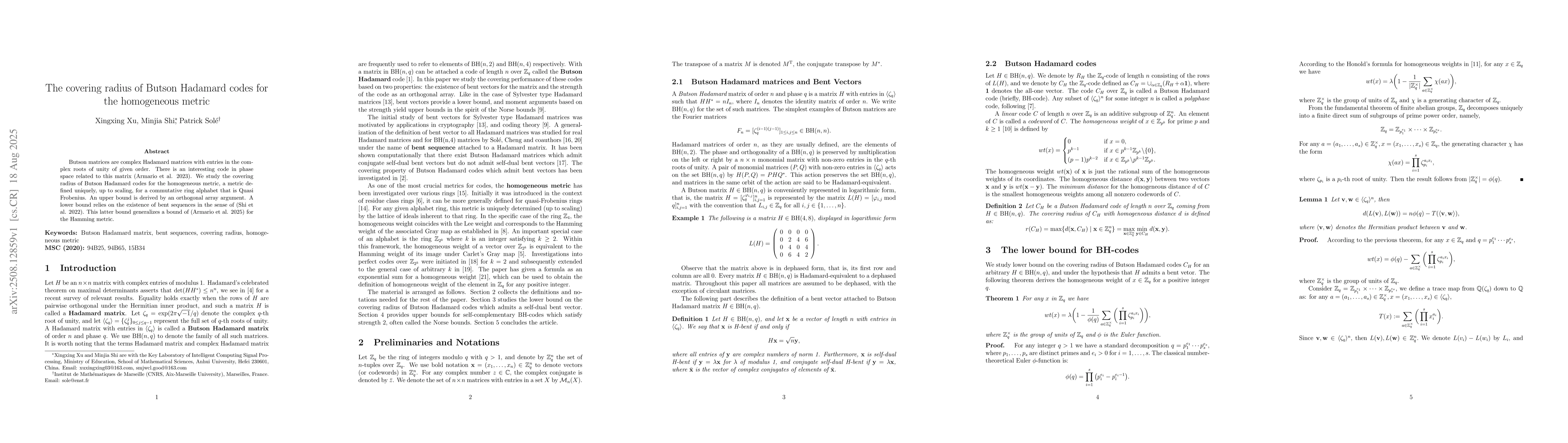 Butson matrices are complex Hadamard matrices with entries in the complex roots of unity of given order. There is an interesting code in phase space related to this matrix (Armario et al. 2023). We study the covering radius of Butson Hadamard codes for the homogeneous metric, a metric defined uniquely, up to scaling, for a commutative ring alphabet that is Quasi Frobenius. An upper bound is derived by an orthogonal array argument. A lower bound relies on the existence of bent sequences in the sense of (Shi et al. 2022). This latter bound generalizes a bound of (Armario et al. 2025) for the Hamming metric.