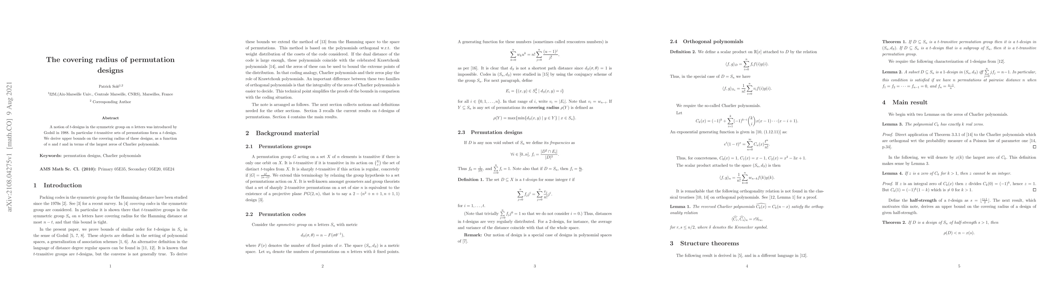 The paper derives upper bounds on the covering radius of t-transitive permutation designs using Charlier polynomials and their properties, specifically focusing on the largest zeros of these polynomials.