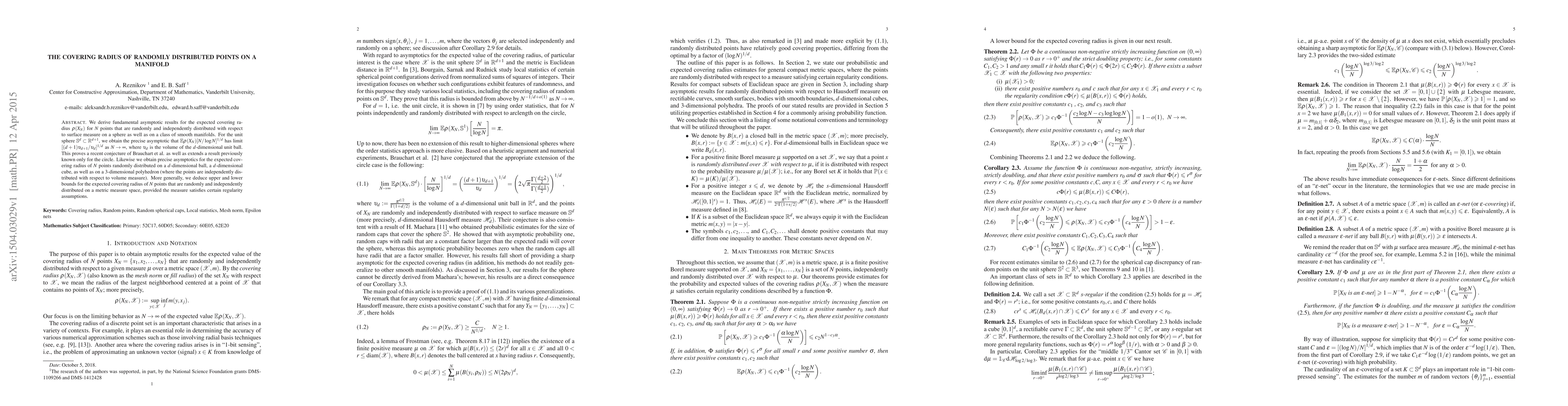 This paper derives asymptotic results for the expected covering radius of randomly distributed points on various manifolds, including spheres, balls, cubes, and polyhedra. It confirms a conjecture for the unit sphere and extends previous results to other shapes, providing precise limits and bounds for these covering radii.