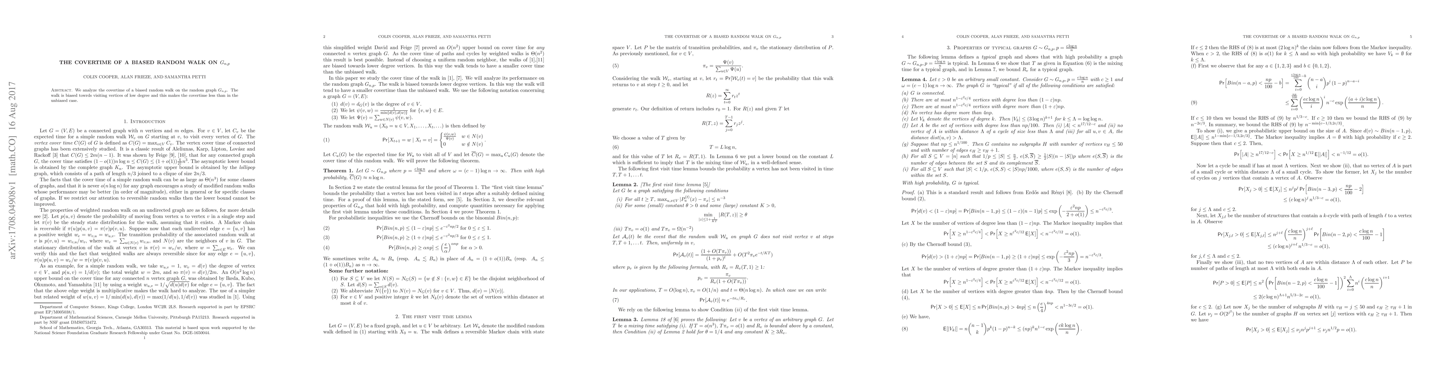 We analyze the covertime of a biased random walk on the random graph $G_{n,p}$. The walk is biased towards visiting vertices of low degree and this makes the covertime less than in the unbiased case