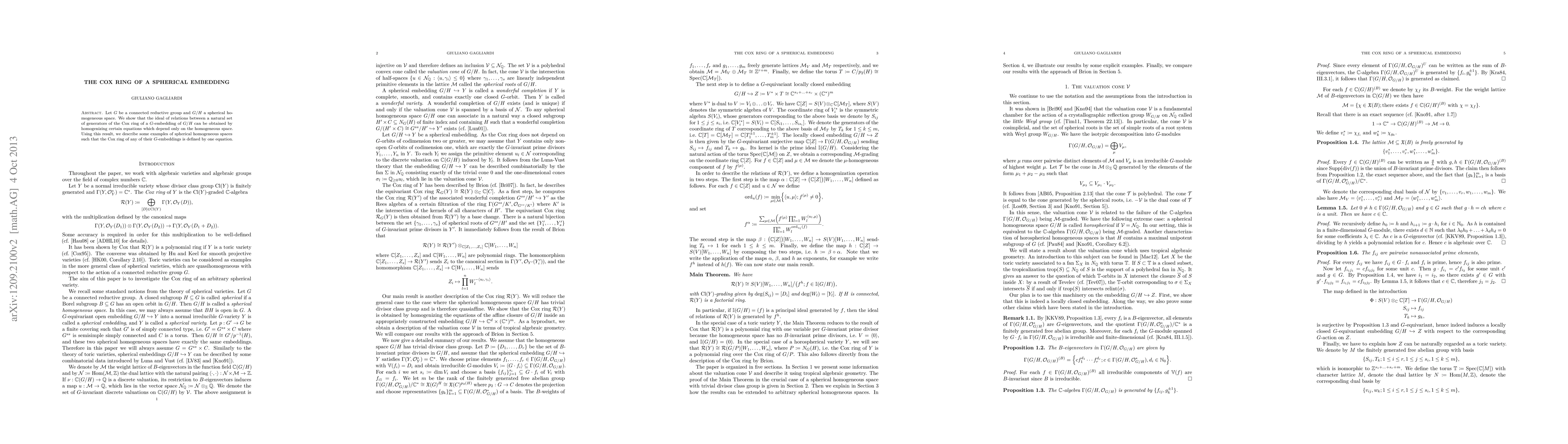 This paper explores the Cox ring of a spherical embedding by a reductive group, demonstrating that the relations in its generators can be derived from specific homogeneous equations tied to the space itself. It concludes with examples showing that certain spherical homogeneous spaces have Cox rings defined by a single equation.