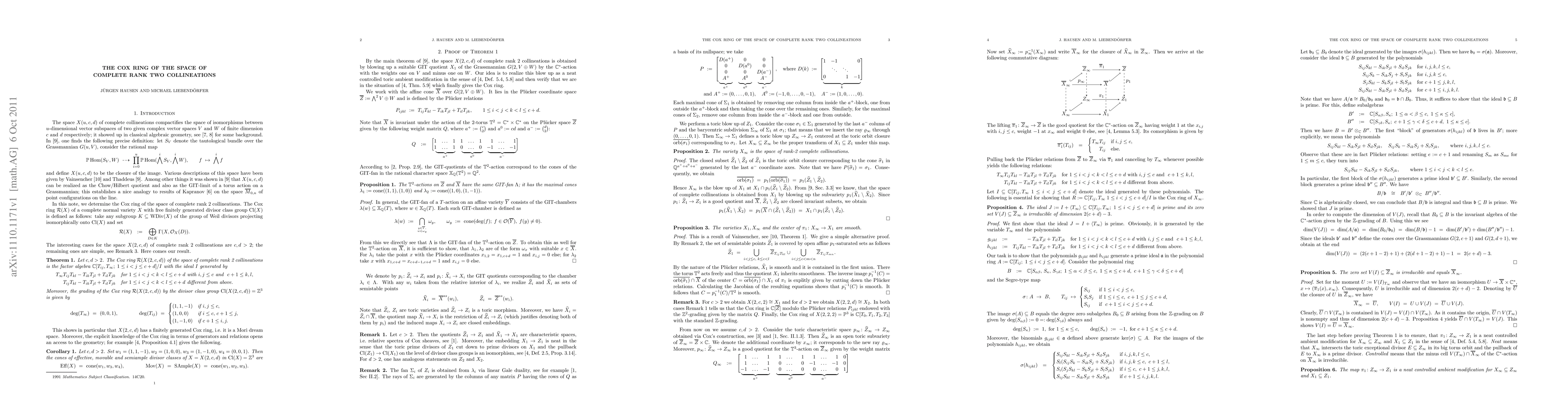 Summary: This paper identifies the Cox ring structure of the space of complete rank two collineations, providing a detailed algebraic framework for understanding this geometric object. The findings contribute to the broader study of algebraic geometry and its applications.