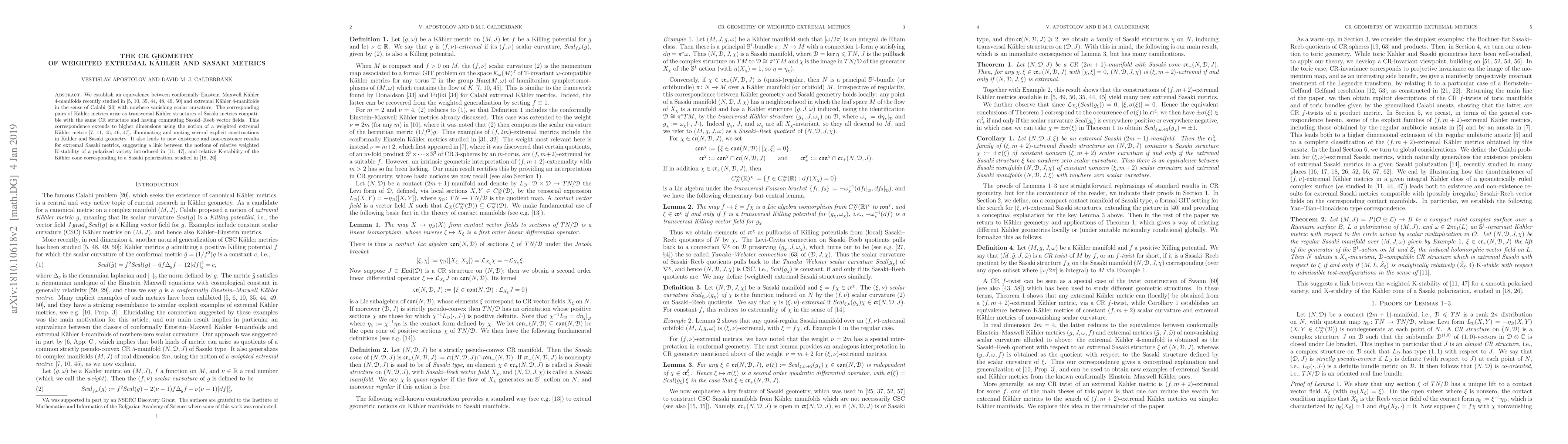 We establish an equivalence between conformally Einstein--Maxwell Kahler 4-manifolds (recently studied in many works) and extremal Kahler 4-manifolds (in the sense of Calabi) with nowhere vanishing scalar curvature. The corresponding pairs of Kahler metrics arise as transversal Kahler structures of Sasaki metrics compatible with the same CR structure and having commuting Sasaki--Reeb vector fields. This correspondence extends to higher dimensions using the notion of a weighted extremal Kahler metric, illuminating and uniting several explicit constructions in Kahler and Sasaki geometry. It also leads to new existence and non-existence results for extremal Sasaki metrics, suggesting a link between notions of relative weighted K-stability for a polarized variety, and relative K-stability of the Kahler cone corresponding to a Sasaki polarization.