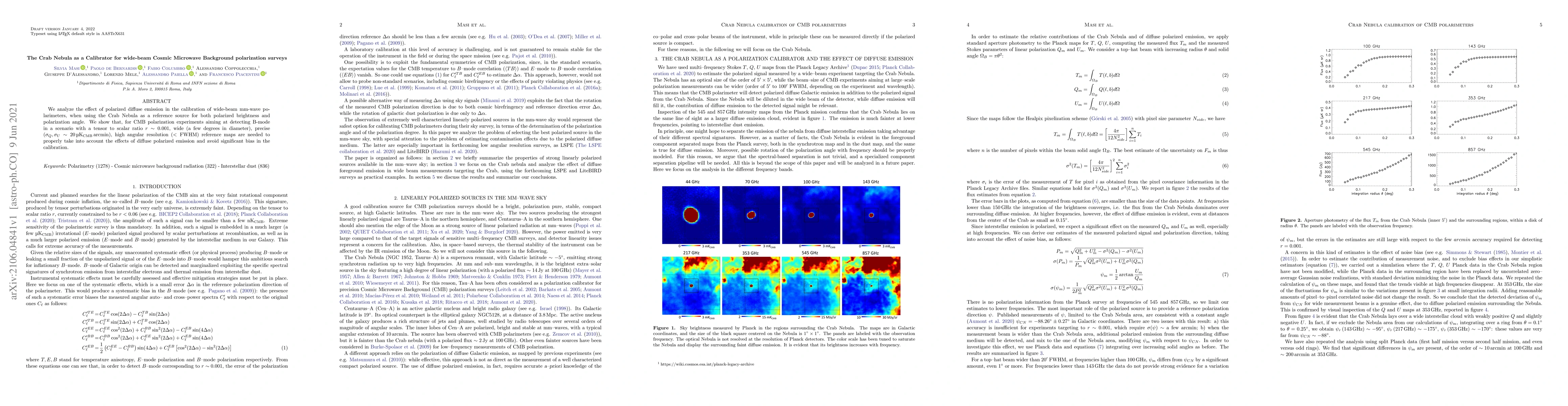 This paper investigates the use of the Crab Nebula as a calibrator for wide-beam mm-wave polarimeters in Cosmic Microwave Background (CMB) polarization surveys, emphasizing the need for precise, high angular resolution reference maps to mitigate biases from polarized diffuse emission. It concludes that such maps are essential for detecting B-modes in scenarios with a tensor to scalar ratio of $r \sim 0.001$.