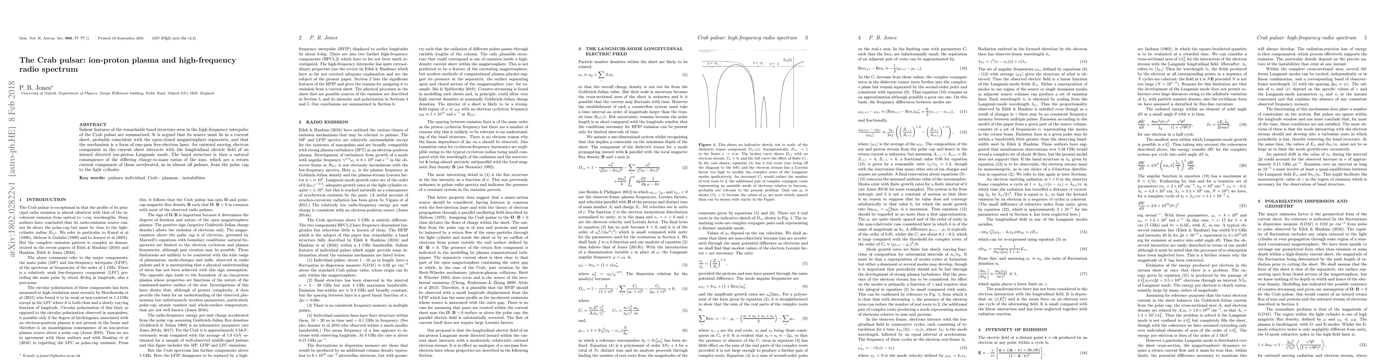 Salient features of the remarkable band structure seen in the high-frequency interpulse of the Crab pulsar are summarized. It is argued that its source must lie in a current sheet, probably coincident with the open-closed magnetosphere separatrix, and that the mechanism is a form of one-pass free-electron laser. An outward moving electron component in the current sheet interacts with the longitudinal electric field of an inward directed ion-proton Lamgmuir mode. The band structure is then a natural consequence of the differing charge-to-mass ratios of the ions, which are a return current component of those accelerated, as in almost all pulsars, from the polar cap to the light cylinder.