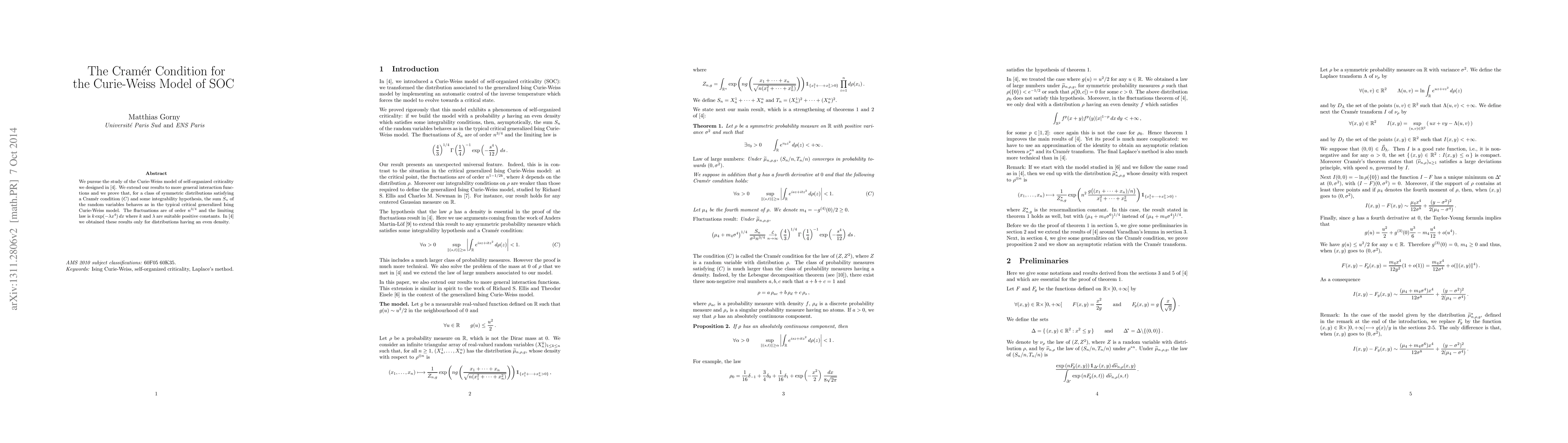 We pursue the study of the Curie-Weiss model of self-organized criticality we designed in arXiv:1301.6911. We extend our results to more general interaction functions and we prove that, for a class of symmetric distributions satisfying a Cram\'er condition $(C)$ and some integrability hypothesis, the sum $S_{n}$ of the random variables behaves as in the typical critical generalized Ising Curie-Weiss model. The fluctuations are of order $n^{3/4}$ and the limiting law is $k \exp(-\lambda x^{4})\,dx$ where $k$ and $\lambda$ are suitable positive constants. In arXiv:1301.6911 we obtained these results only for distributions having an even density.