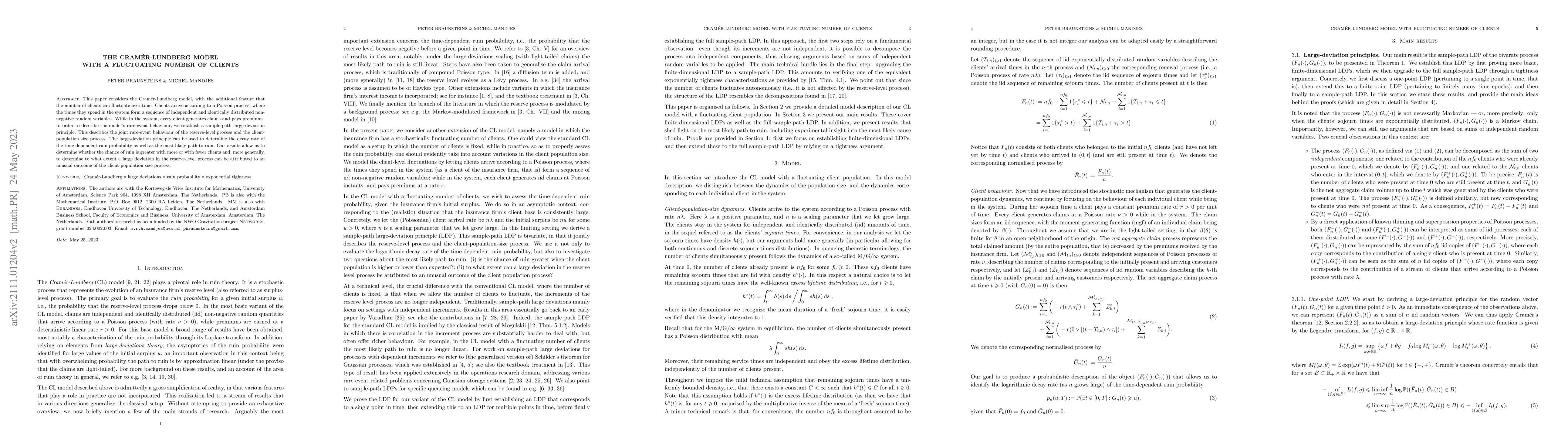 This paper considers the Cram\'er-Lundberg model, with the additional feature that the number of clients can fluctuate over time. Clients arrive according to a Poisson process, where the times they spend in the system form a sequence of independent and identically distributed non-negative random variables. While in the system, every client generates claims and pays premiums. In order to describe the model's rare-event behaviour, we establish a sample-path large-deviation principle. This describes the joint rare-event behaviour of the reserve-level process and the client-population size process. The large-deviation principle can be used to determine the decay rate of the time-dependent ruin probability as well as the most likely path to ruin. Our results allow us to determine whether the chance of ruin is greater with more or with fewer clients and, more generally, to determine to what extent a large deviation in the reserve-level process can be attributed to an unusual outcome of the client-population size process.