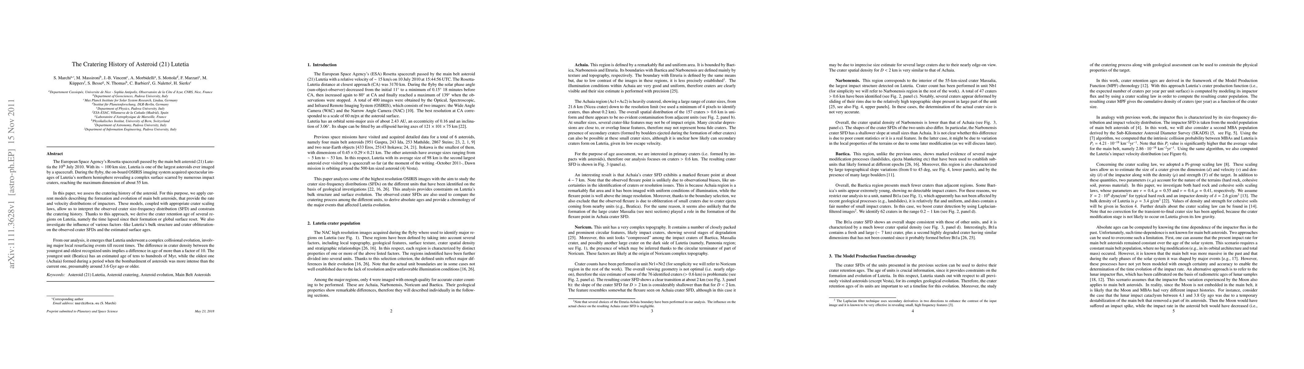 This paper analyzes the cratering history of asteroid (21) Lutetia using images from the Rosetta spacecraft and models of asteroid evolution. The study reveals a complex collisional history, with significant resurfacing events, and estimates the ages of different regions, showing a difference in age by more than a factor of 10 between the youngest and oldest units.