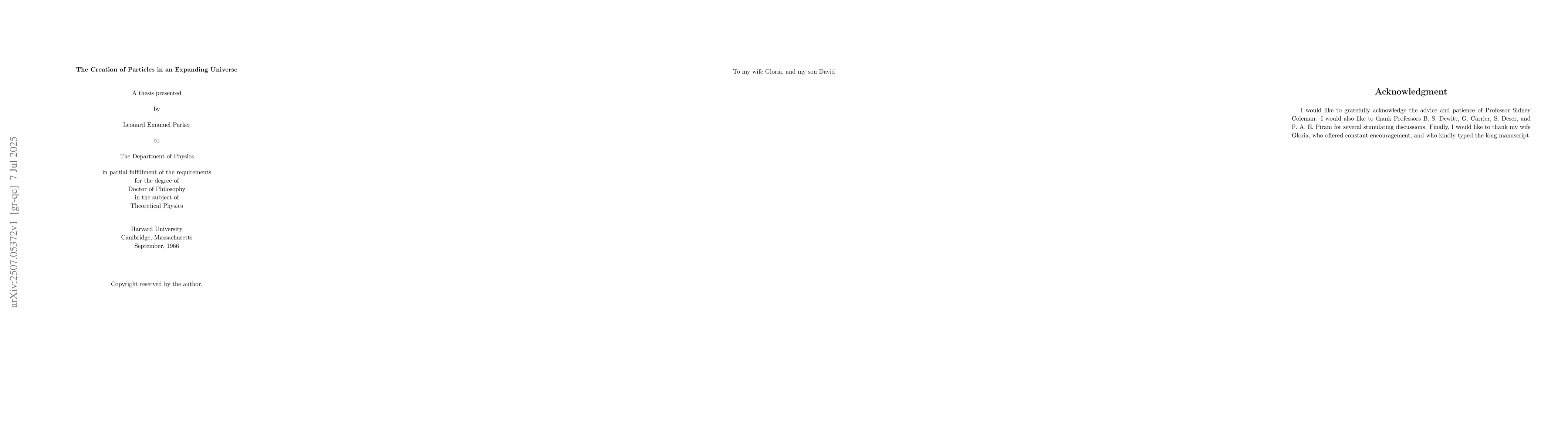 This document is the Ph.D. thesis of Leonard Parker, submitted to Harvard University in 1966. Over the decades, several generations of physicists have been introduced to the concept of particle creation by gravitational fields, a phenomenon that has become a cornerstone in exploring the interplay between gravitation and quantum theory. Yet, the foundational breakthrough that led to the prediction and understanding of this phenomenon remains unfamiliar to many. In the interest of historical accuracy and in recognition of a seminal contribution to physics, the thesis has been retyped and made it freely available as an open-access (arXiv) document. The reissued thesis is accompanied by a Foreword that places the work in its proper historical context. As the team responsible for this new edition, we (Antonio Ferreiro, Jos\'e Navarro-Salas, and Silvia Pla) hope that future generations will continue to draw inspiration from this pioneering text.