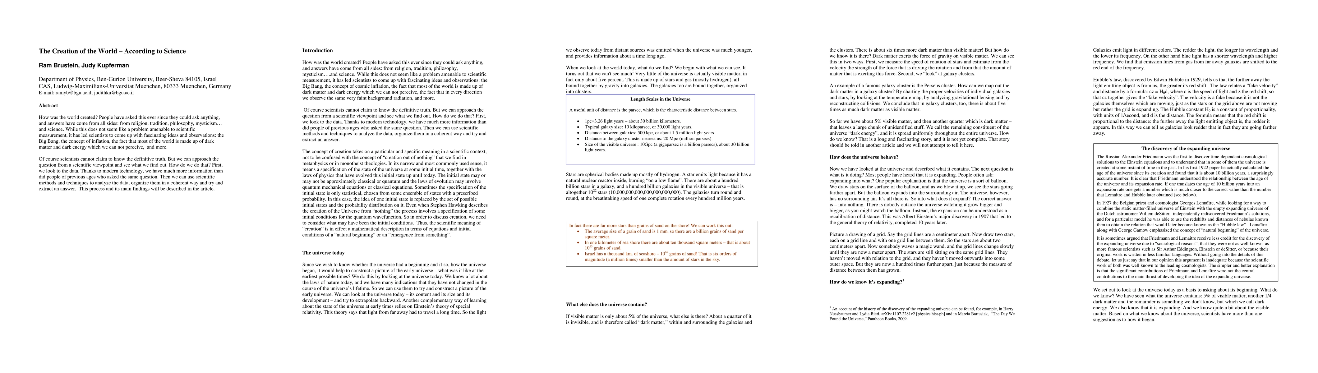 How was the world created? People have asked this ever since they could ask anything, and answers have come from all sides: from religion, tradition, philosophy, mysticism... and science. While this does not seem like a problem amenable to scientific measurement, it has led scientists to come up with fascinating ideas and observations: the Big Bang, the concept of inflation, the fact that most of the world is made up of dark matter and dark energy which we can not perceive, and more. Of course scientists cannot claim to know the definitive truth. But we can approach the question from a scientific viewpoint and see what we find out. How do we do that? First, we look to the data. Thanks to modern technology, we have much more information than did people of previous ages who asked the same question. Then we can use scientific methods and techniques to analyze the data, organize them in a coherent way and try and extract an answer. This process and its main findings will be described in the article.