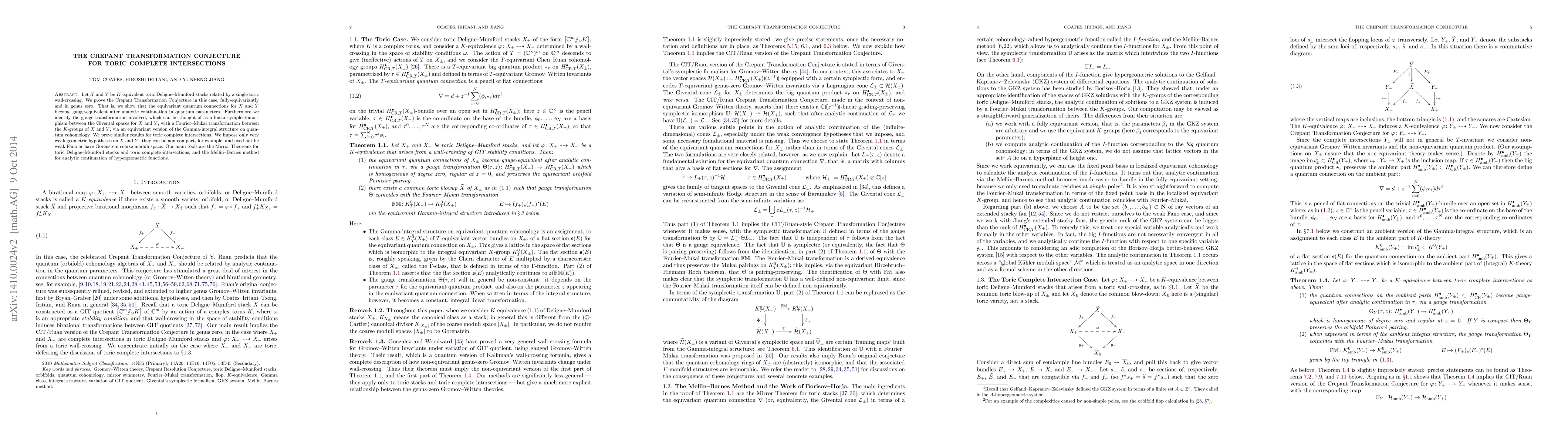 This paper proves the Crepant Transformation Conjecture for toric Deligne-Mumford stacks and complete intersections, demonstrating the gauge-equivalence of equivariant quantum connections after analytic continuation, and relating this to Fourier-Mukai transformations. The study uses Mirror Theorems and the Mellin-Barnes method, with minimal geometric restrictions on the spaces considered.